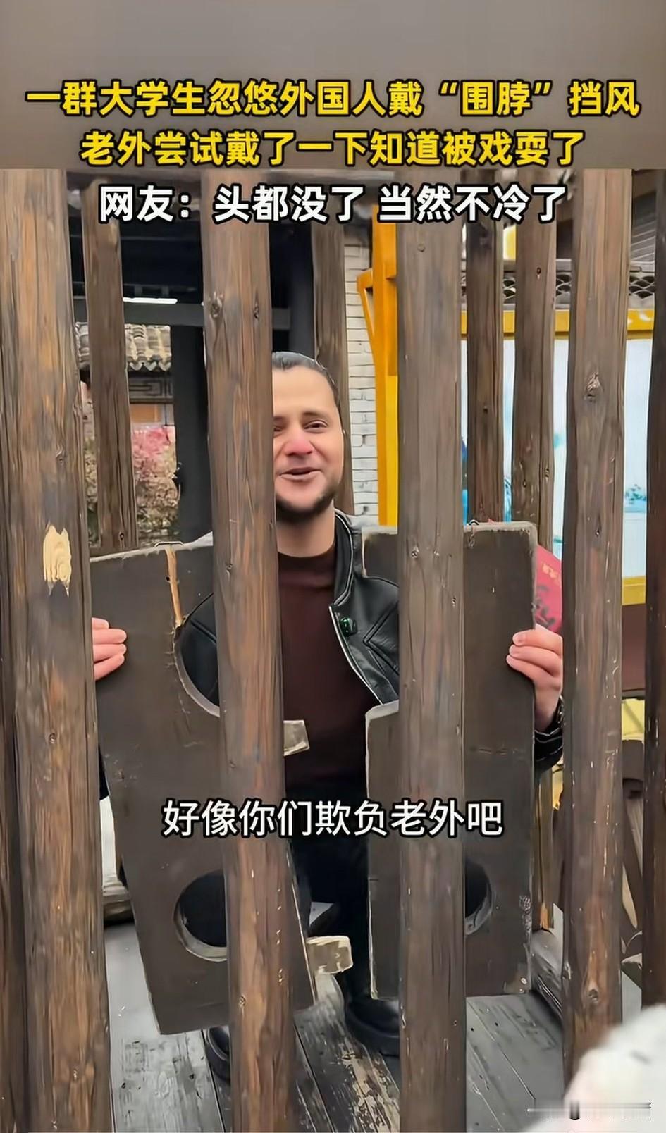 景区里面的一名老外吸引了一群大学生,那老外问大学生这是干嘛的? 这些大学生真的把他当日本人整, 竟然骗他说这是围脖, 老外不可置信的拿起了木枷子, 大学生忽悠他,打开了才能戴上, 老外将信将疑的打开了戴在脖子上, 不过疑惑的眼神看向了周围哈哈大笑的人群,他这才感觉自己被忽悠了, 连忙帮忙取了下来, 还说你们真当我不知道吗? 实际上他根本不知道这是干什么的? 这实际上就是古代人贩子的木笼子, 还要带上这个囚犯枷, 就相当于现在的手铐, 洋相还真需要洋人来出! 大家觉得好玩吗? 每人推荐一个旅行目的地 外国人 留学生旅游 洋人留学生