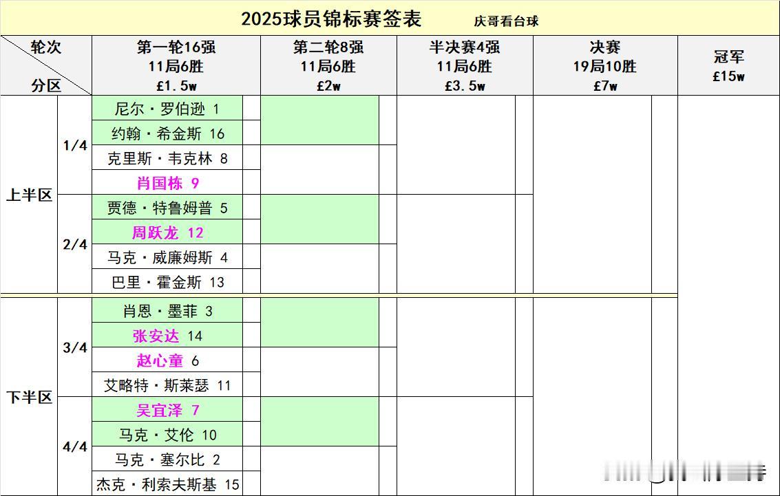 球员锦标赛今日开杆,本项赛事门槛很高,只有单赛季前16的选手才能参赛,而卫冕冠军凯伦威尔逊本赛季排名赛表现不佳,未获得参赛资格。而奥沙利文选手退赛,希金斯替补参赛。 中国共有5名选手参赛,分别是肖国栋、赵心童、吴宜泽、周跃龙和张安达,赵心童和张安达主要是靠上一站香港大奖赛冠亚军,挣到足够的积分参赛的。 交手记录 艾伦2-1吴宜泽 韦克林5-1肖国栋 特鲁姆普7-1周跃龙 墨菲5-1张安达 赵心童1-0斯莱瑟 中国选手除了赵心童,基本处于下风,赢球需要爆冷。 今天晚上9点,吴宜泽对阵艾伦 凌晨3点,肖国栋对阵韦克林 敬请关注中国球员表现。