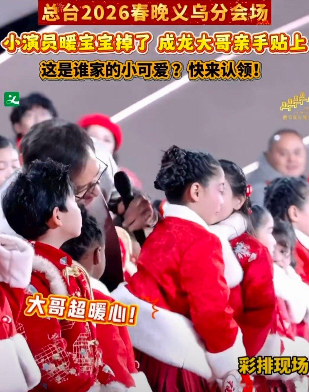 小演员暖宝宝掉了成龙亲手贴上 彩排现场的治愈一刻,成龙亲手为小演员贴暖宝宝,温柔