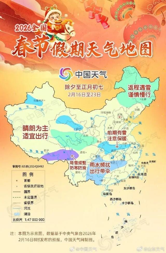 春节假期(除夕至正月初七)期间,我国无大范围雨雪冰冻等灾害天气,总体适宜出行;全国大部地区气温较常年同期偏高1至3℃,但气温起伏较大;节日中期天气条件较好,节日前期和后期将有降水降温过程。