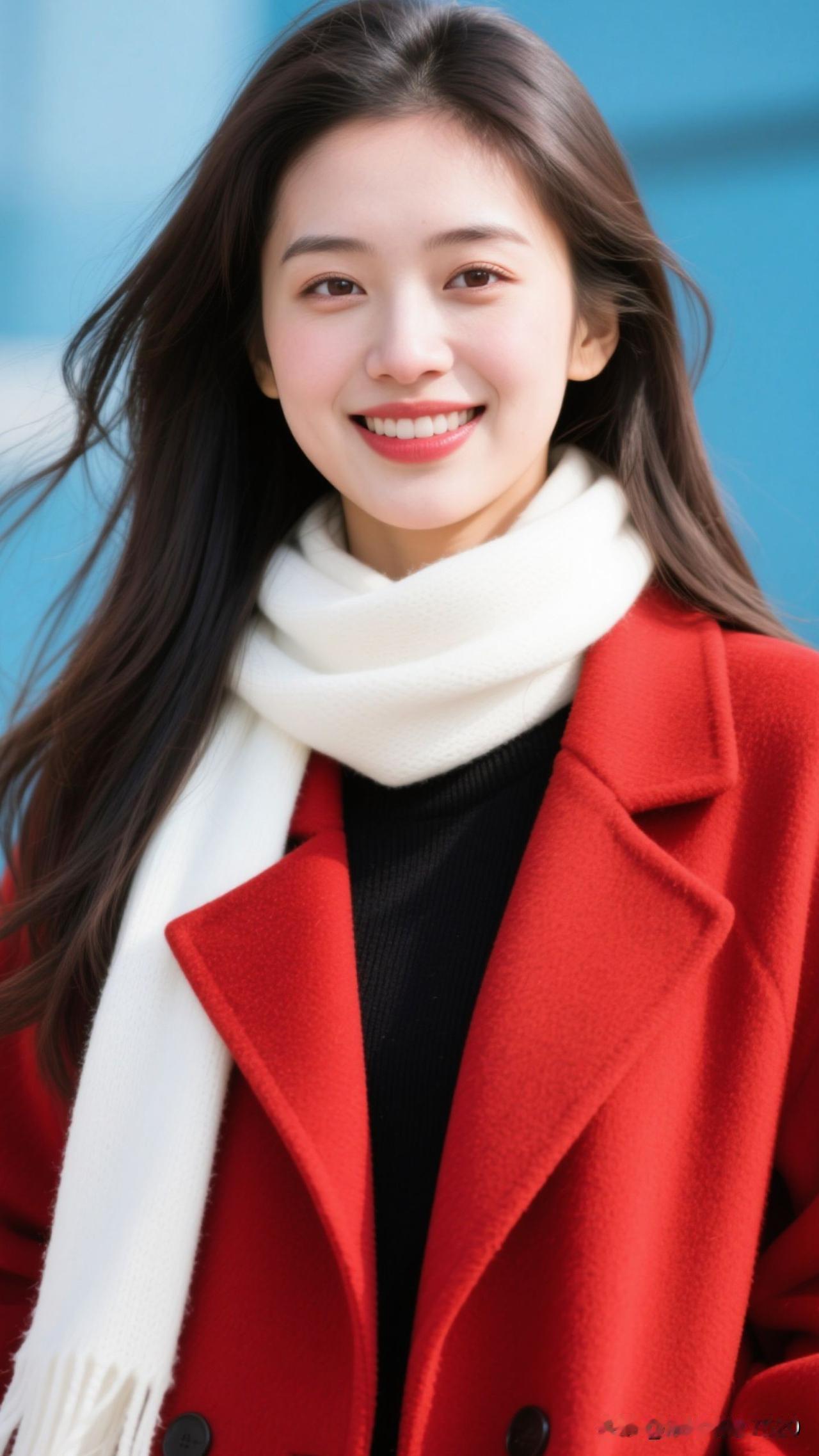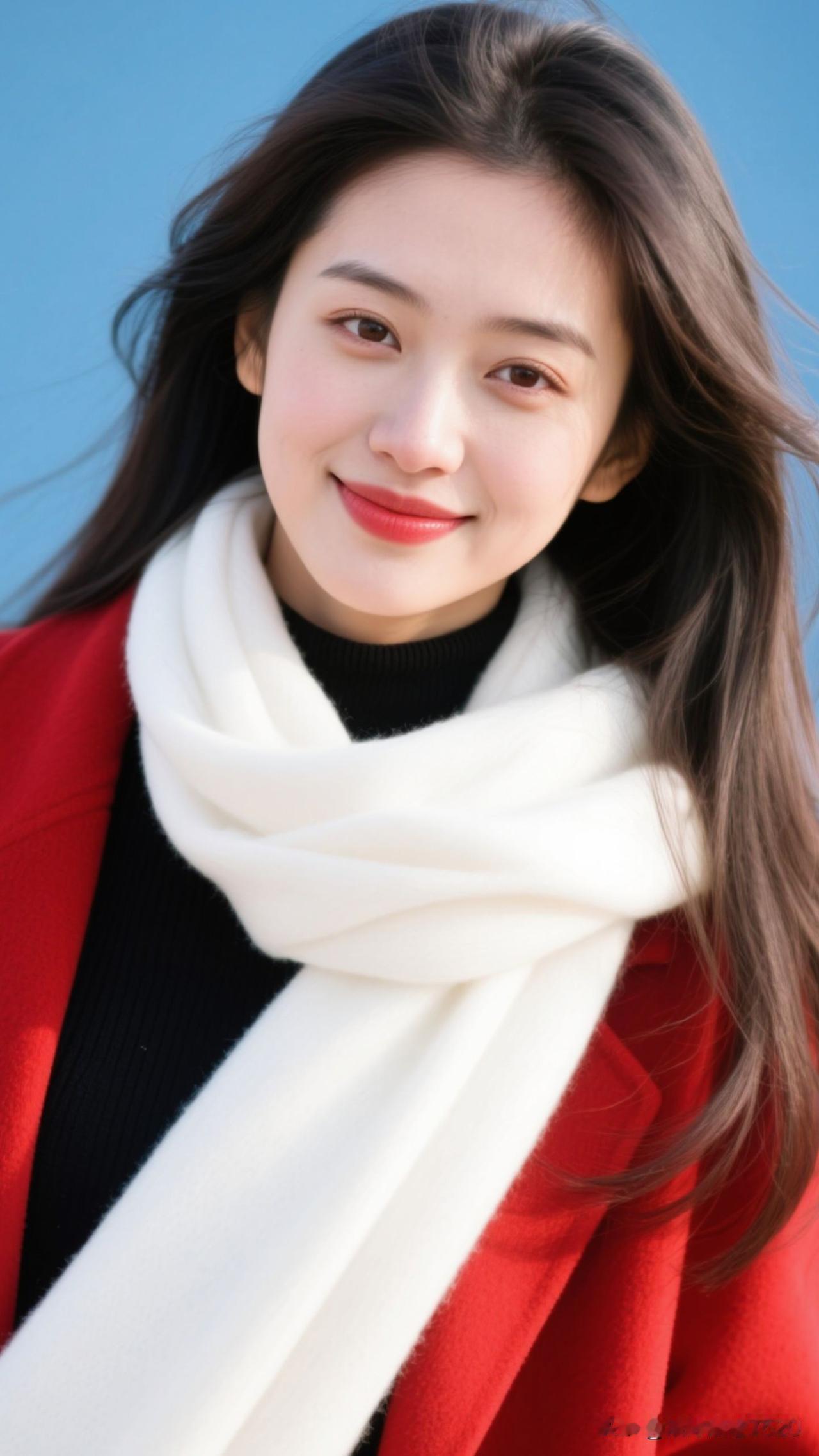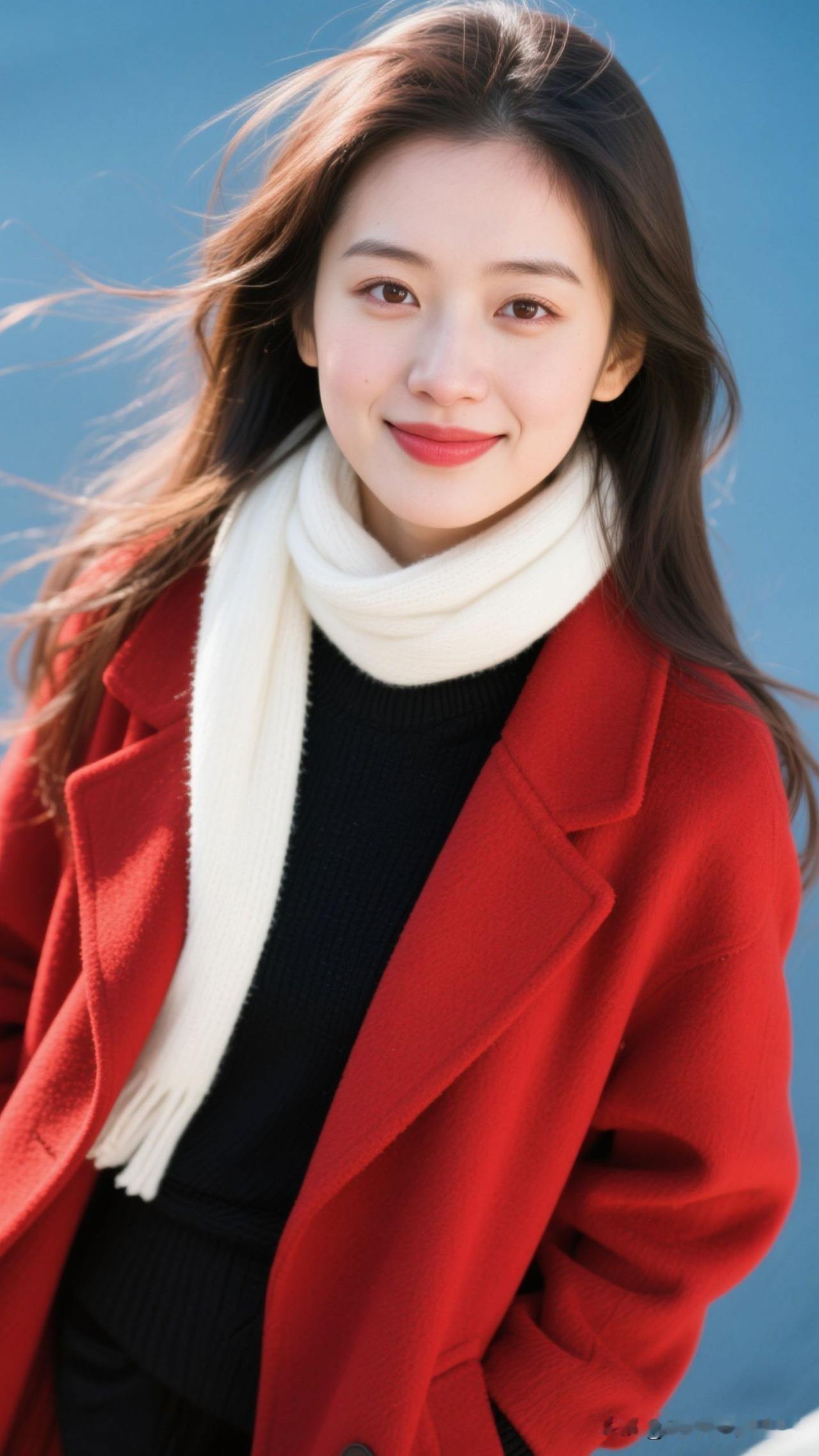 晴空为笺,红衫是晕开的蜜色,白围巾曳着温柔的絮语,一笑便漾满整个冬天的治愈。温柔