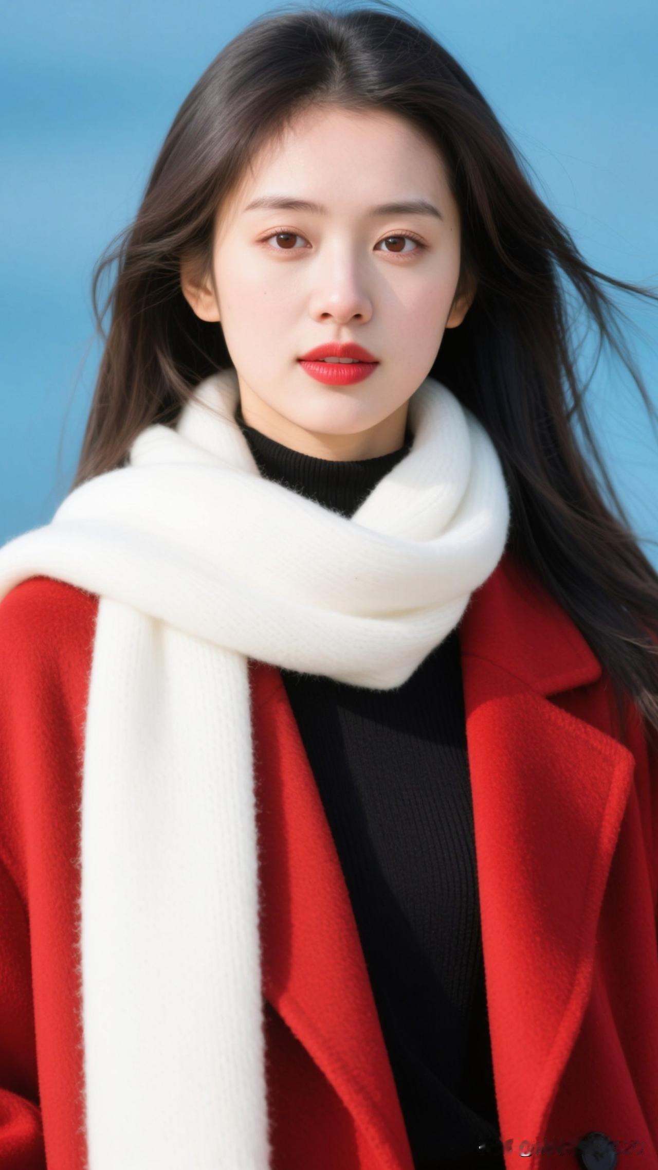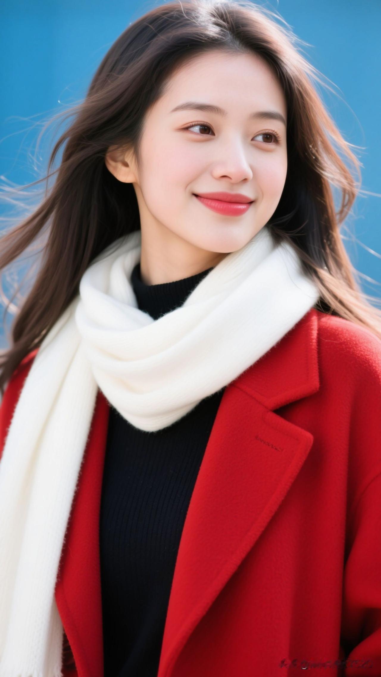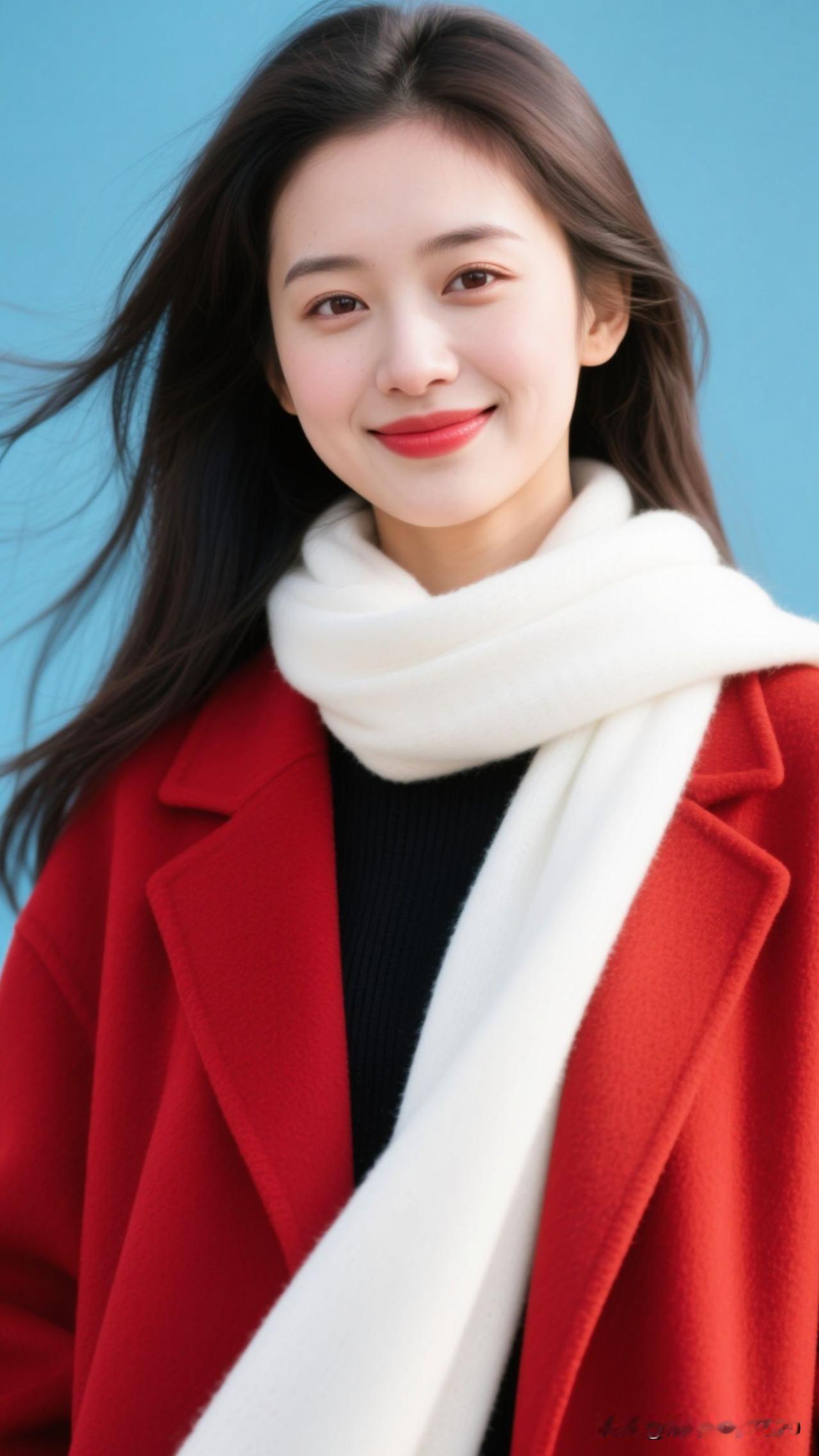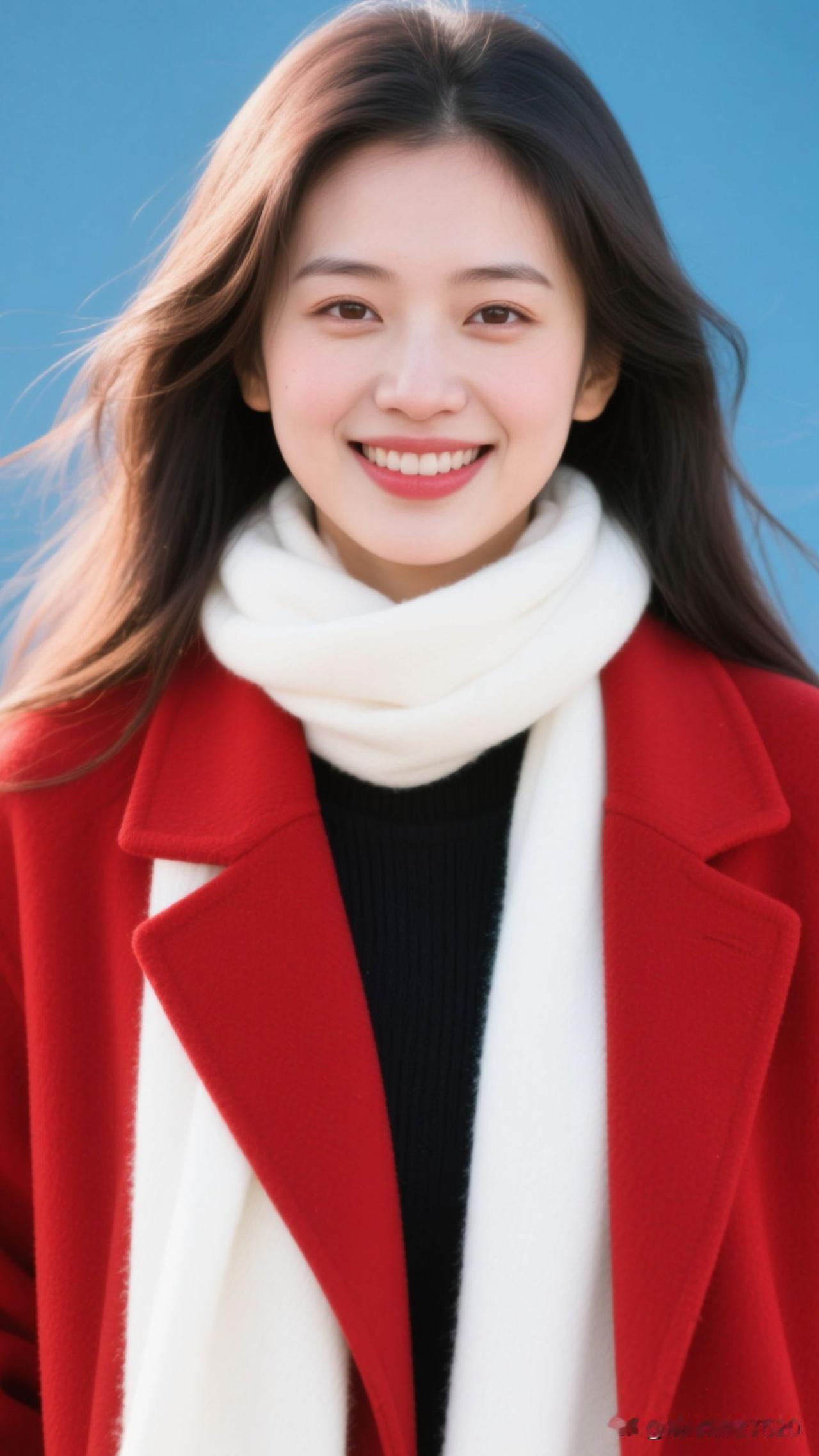 晴空为笺,红衫是晕开的蜜色,白围巾曳着温柔的絮语,一笑便漾满整个冬天的治愈。温柔