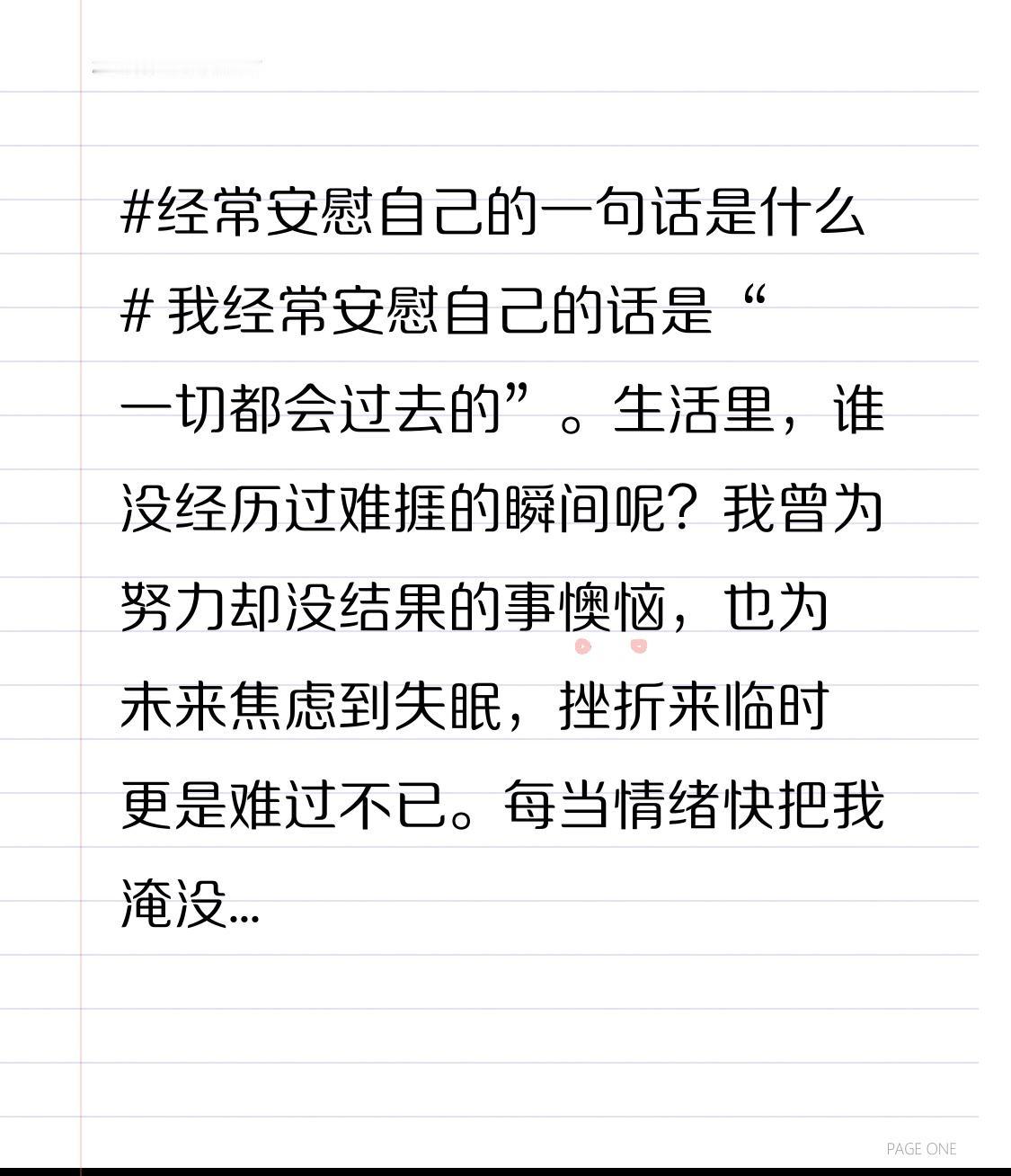 我经常安慰自己的话是“一切都会过去的”。生活里,谁没经历过难捱的瞬间呢?我曾为努力却没结果的事懊恼,也为未来焦虑到失眠,挫折来临时更是难过不已。每当情绪快把我淹没,我就默念这句话。 它就像黑暗中的暖灯,能驱散心头阴霾。人生没有过不去的坎儿,那些伤痛、焦虑和遗憾,都会随时间淡去。顺利时,它提醒我别骄傲;失意时,它给我勇气。人生起起落落,所有经历都是暂时风景。所以啊,不必为一时得失纠结,因为一切都会过去。