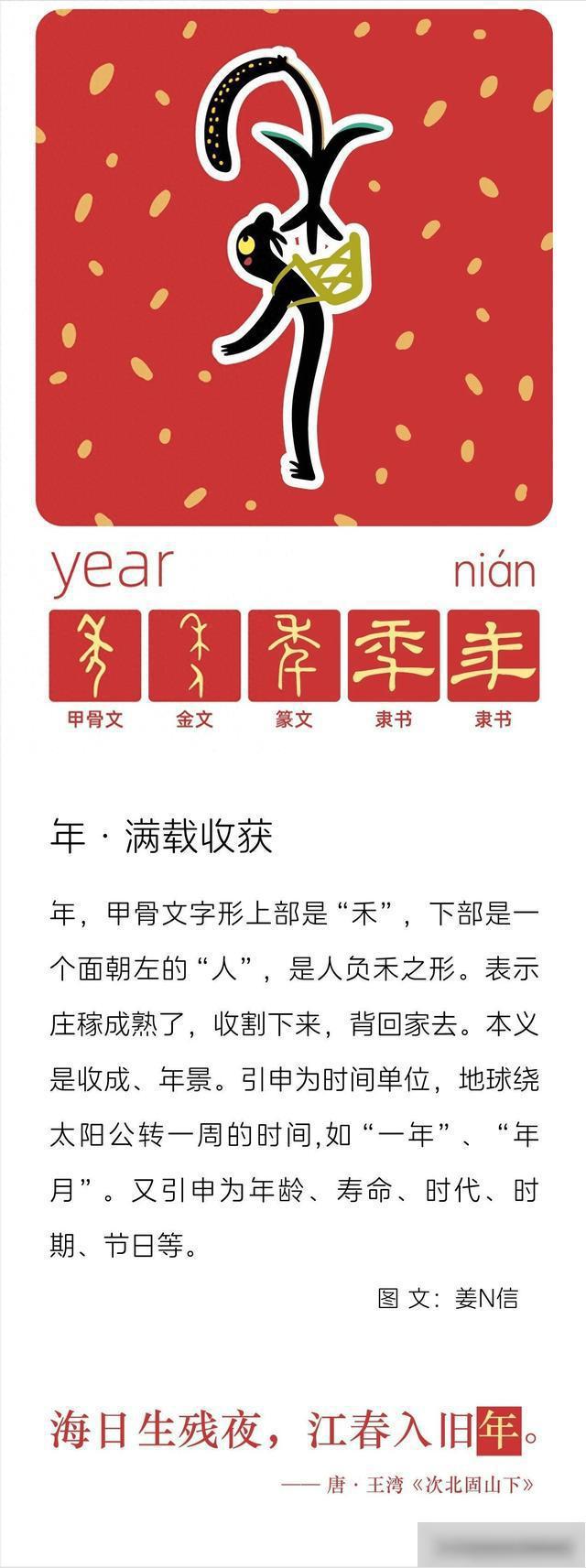 年,甲骨文字形上部是“禾”,下部是一个面朝左的“人”,是人负禾之形。表示庄稼成熟了,收割下来,背回家去。本义是收成、年景。引申为时间单位,地球绕太阳公转一周的时间,如“一年”“年月”。又引申为年龄、寿命、时代、时期、节日等。