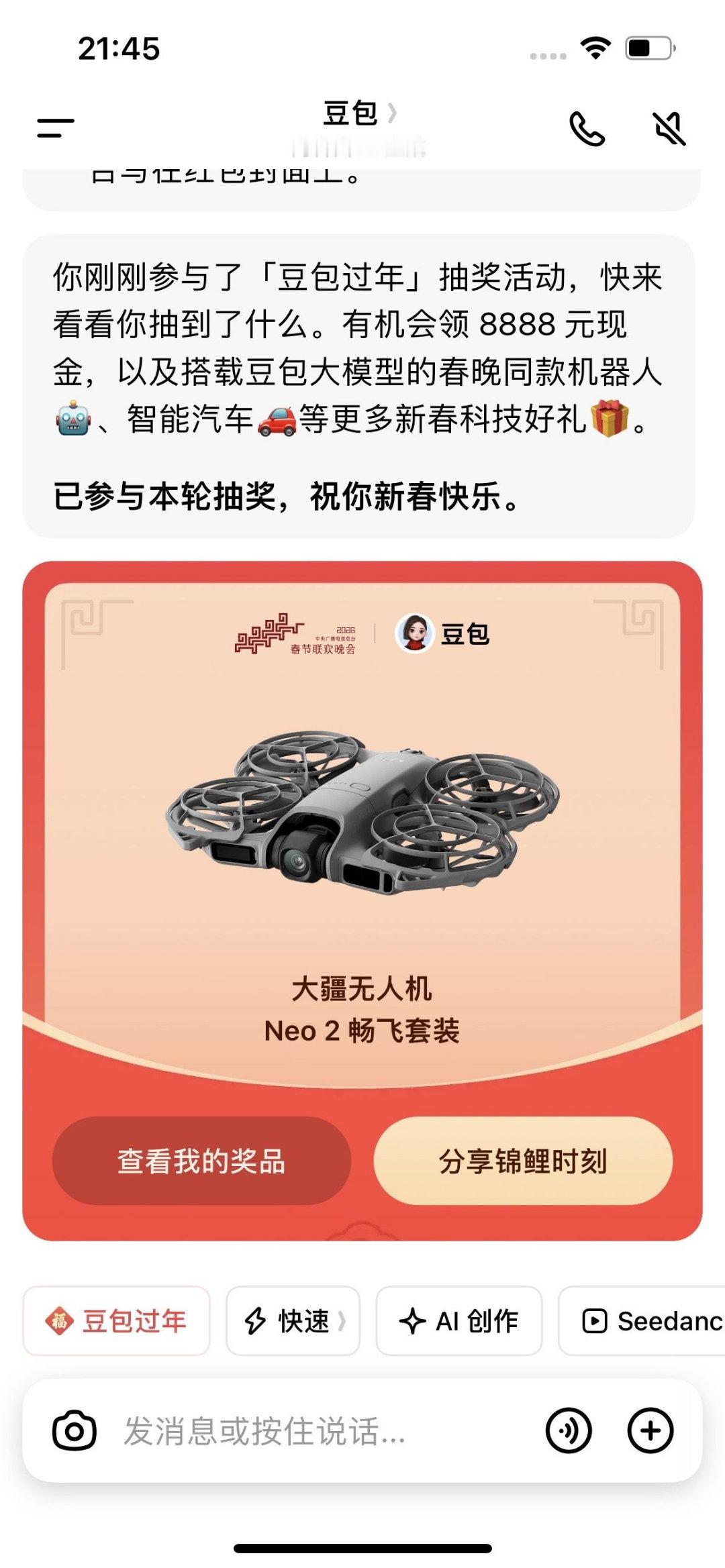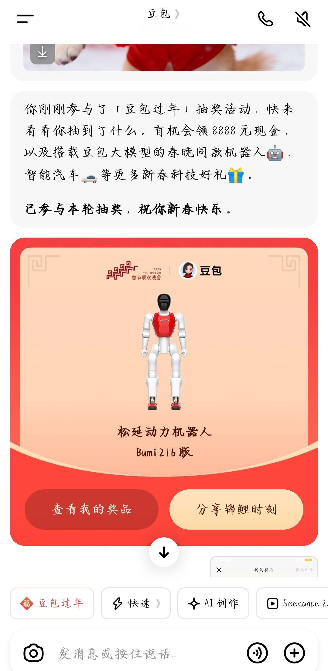 抽中豆包科技大礼的人找到了今年真的是科技AI爆发式增长的一年,连豆包抽奖都是抽的汽车/机器人这些硬核科技产品,不过也不难理解,毕竟作为领先的Ai产品,要让锦鲤感受到未来生活的便捷性!而汽车作为不可或缺的交通工具,占据了我们很大部分的时间;机器人也很有可能在未来替代大量的人力完成工作,这些能带给普通人质的改变,早拥有早享受,实名羡慕了!