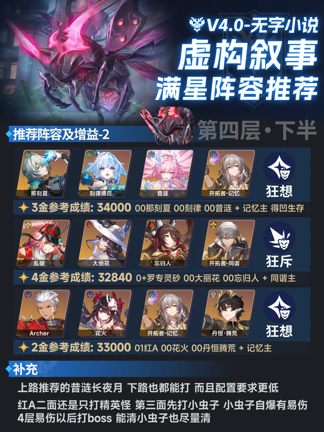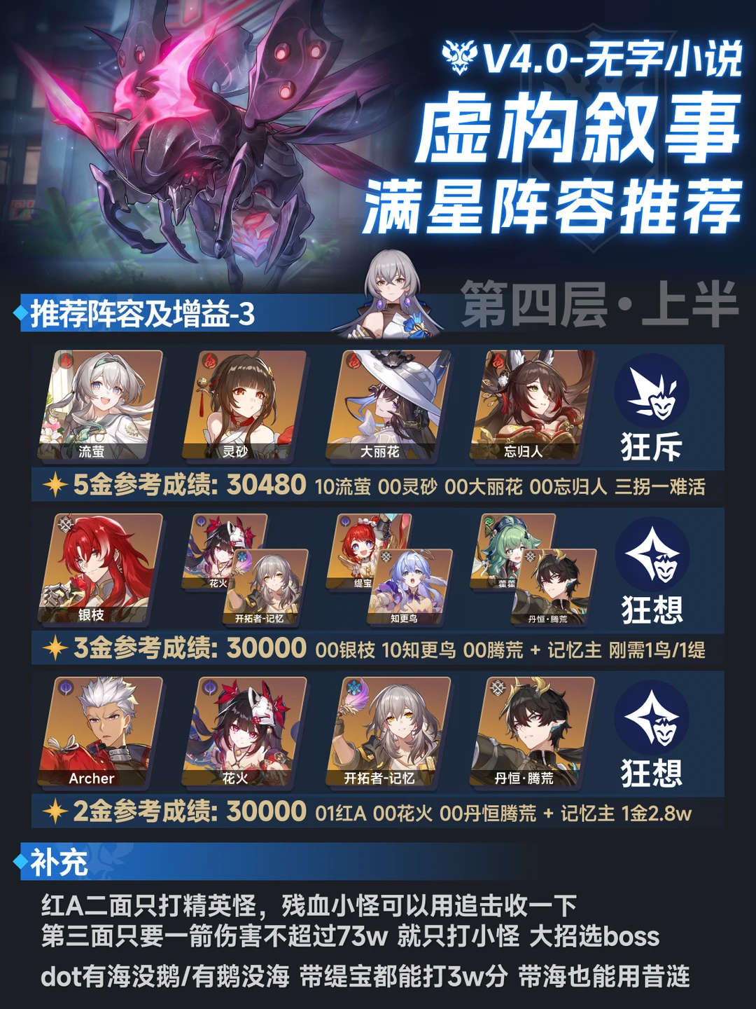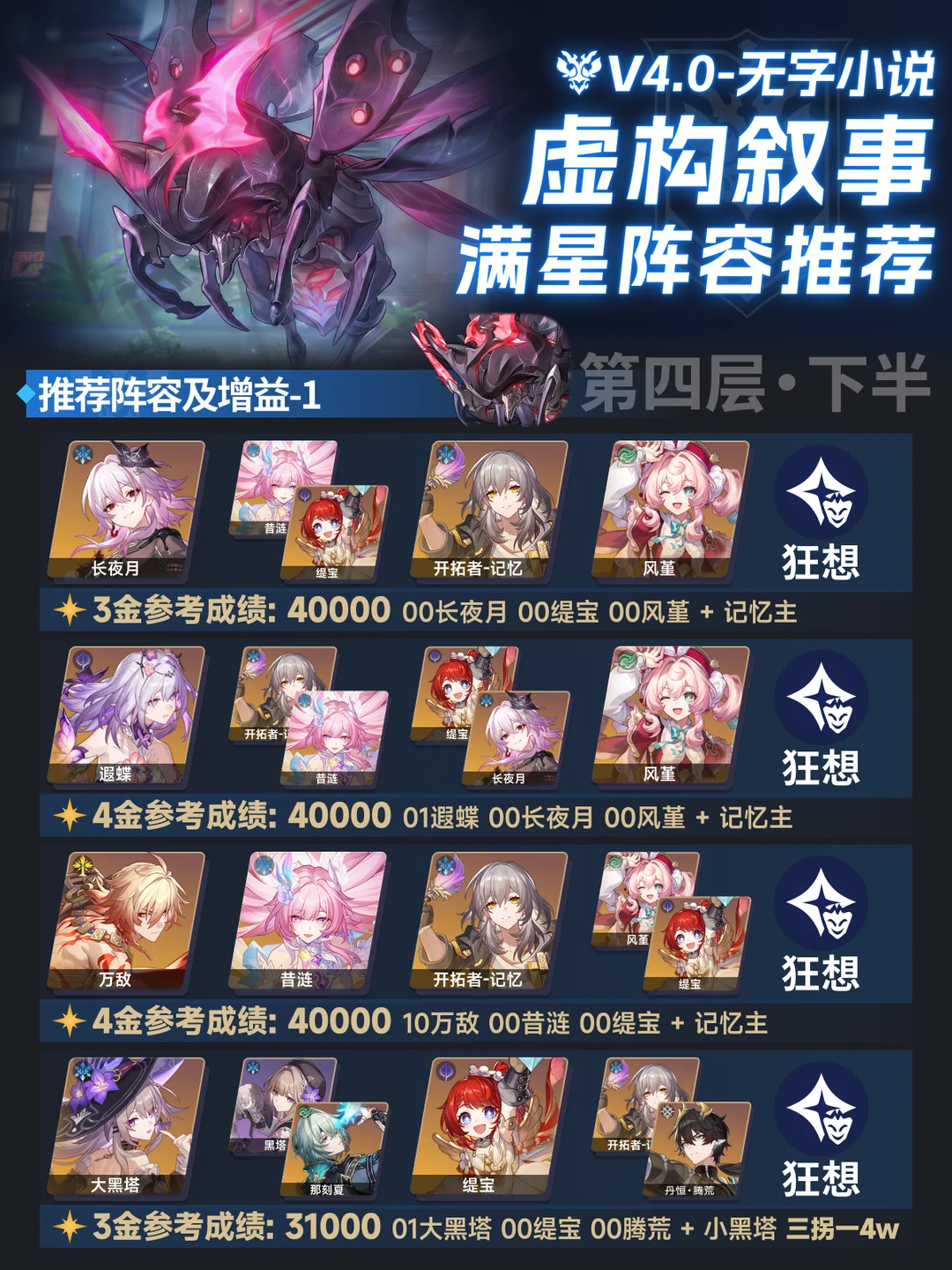 滴滴!这里是辣条 这期是4.0虚构的阵容推荐 今天刚好是除夕,祝大家除夕快乐,新年大吉,不管是生活还是游戏都能一把摸出丝滑好轴~[喝奶茶R] - 虽然但是,红a真能打虚构了 下半全00拿个3w应该问题不大,上半难一点要加金才能压线 另外再补充一套,上半0+1爻光 带艾丝妲+主角+丹恒 选buff1 可以打个3w的及格分,00词条高也能出 dot队除了图上的 1海+卡+缇的4金配置轻松4w -