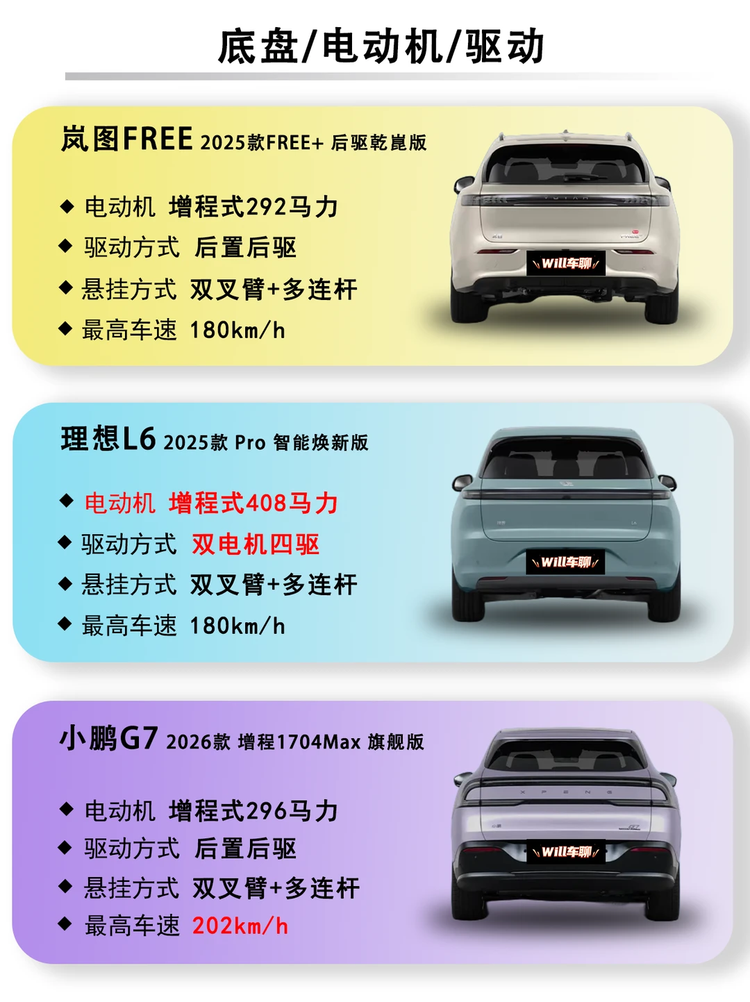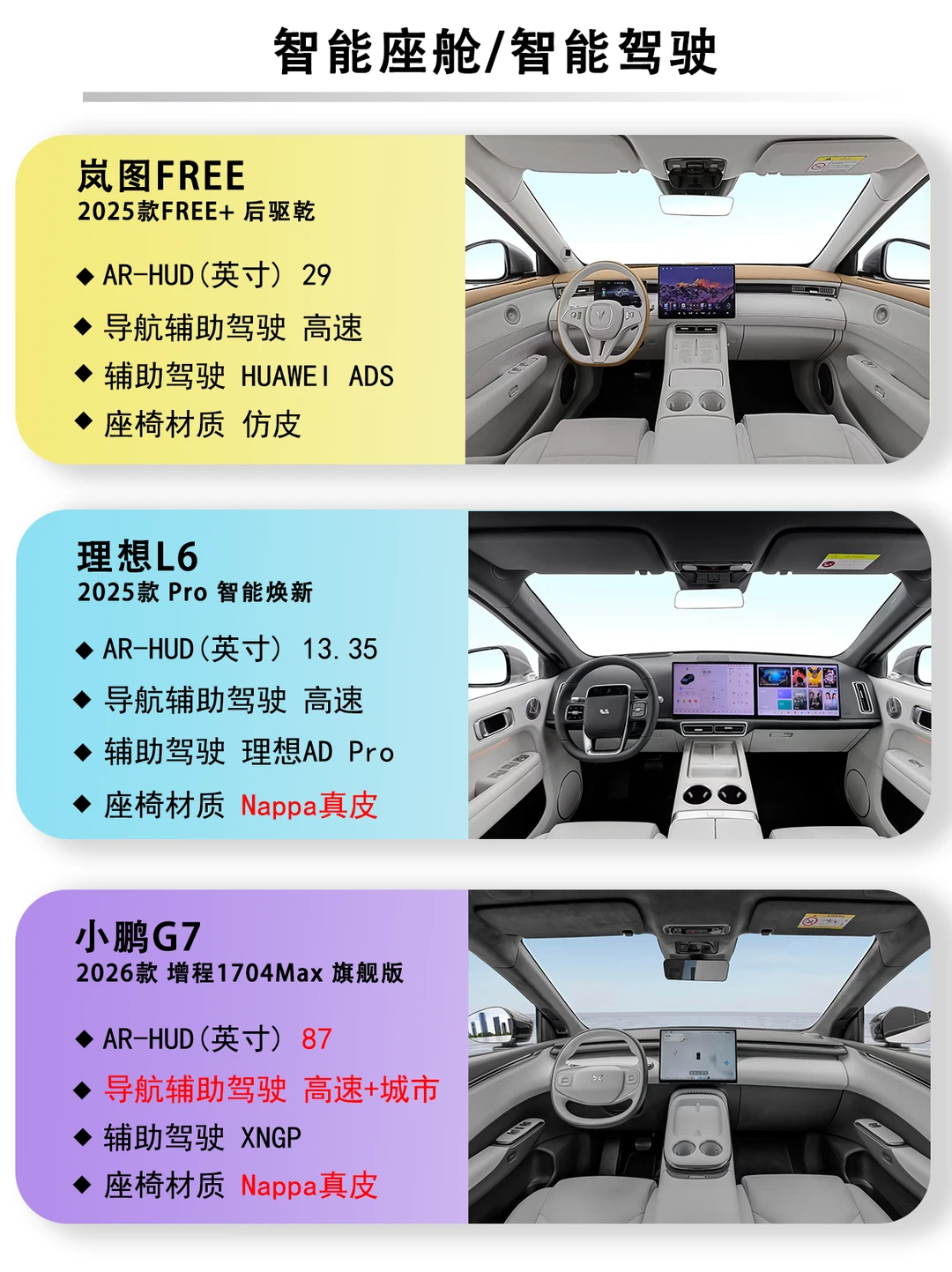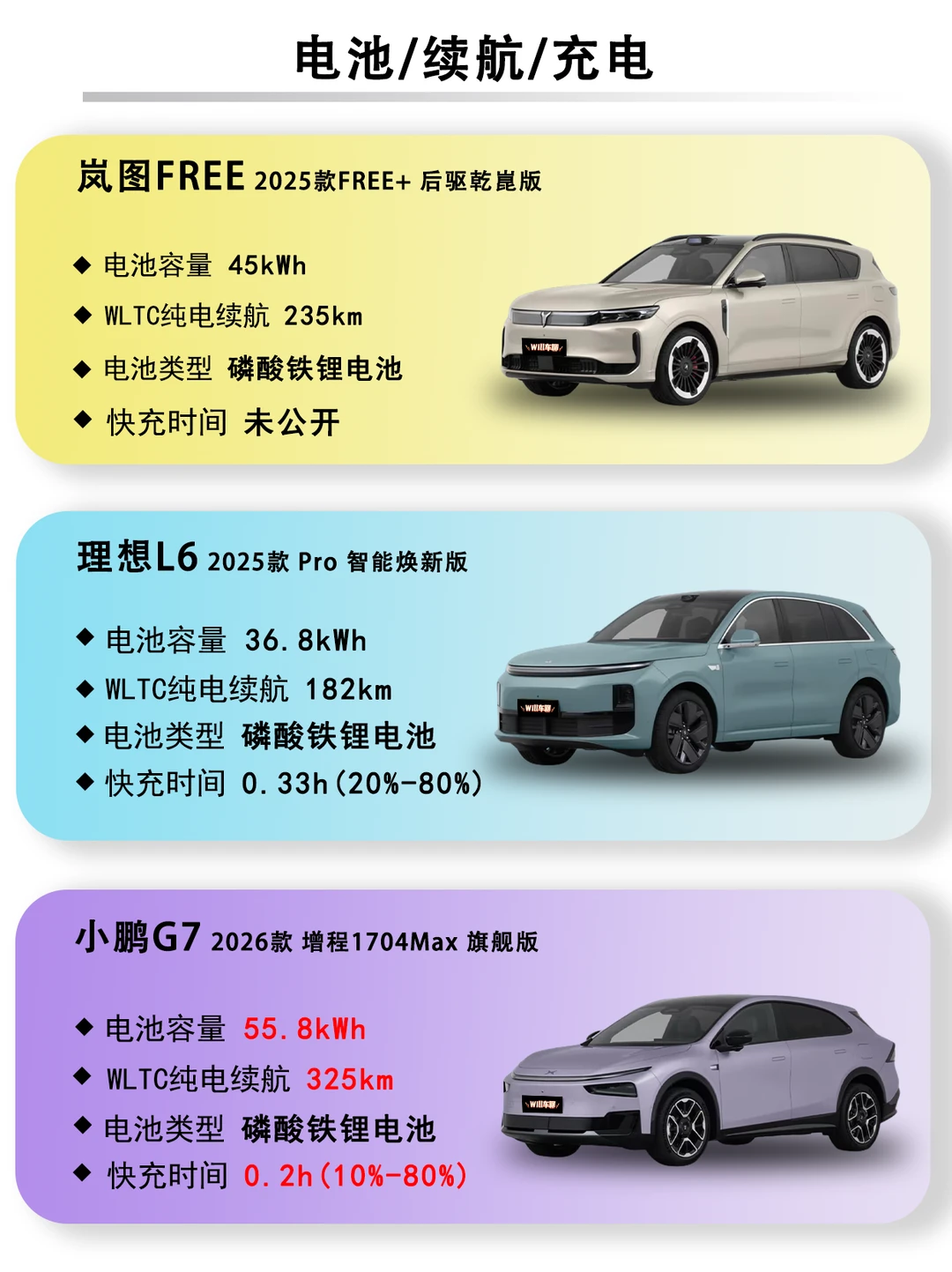 不用纠结,今天对比三款——岚图FREE 2025款FREE+后驱乾崑版(以下车型简称岚图FREE)、理想L6 2025款Pro智能焕新版(以下车型简称理想L6)和小鹏G7 2026款增程1704Max旗舰版(以下车型简称小鹏G7),帮你一眼锁定最适合你的全能座驾!