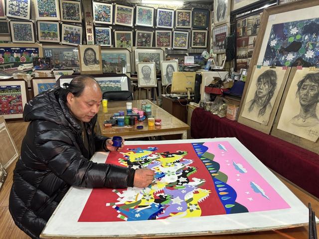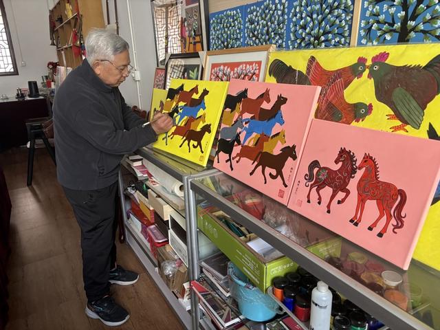 走进金山农民画市级代表性传承人怀明富的工作室,满墙的画作仿佛打开了新春的调色盘。作为金山区第一批农民画艺术家,怀明富从事农民画创作已近四十年。今年春节前夕,他以“马”为主题创作了多幅新作。暖红与明黄铺底,浓艳的骏马错落奔腾,强烈的视觉冲击感扑面而来。而在另一幅画中,两匹大红骏马昂首扬蹄,鎏金鬃毛迎风飘动,马身上点缀着五彩花纹,既有传统韵味,又不失当代审美。