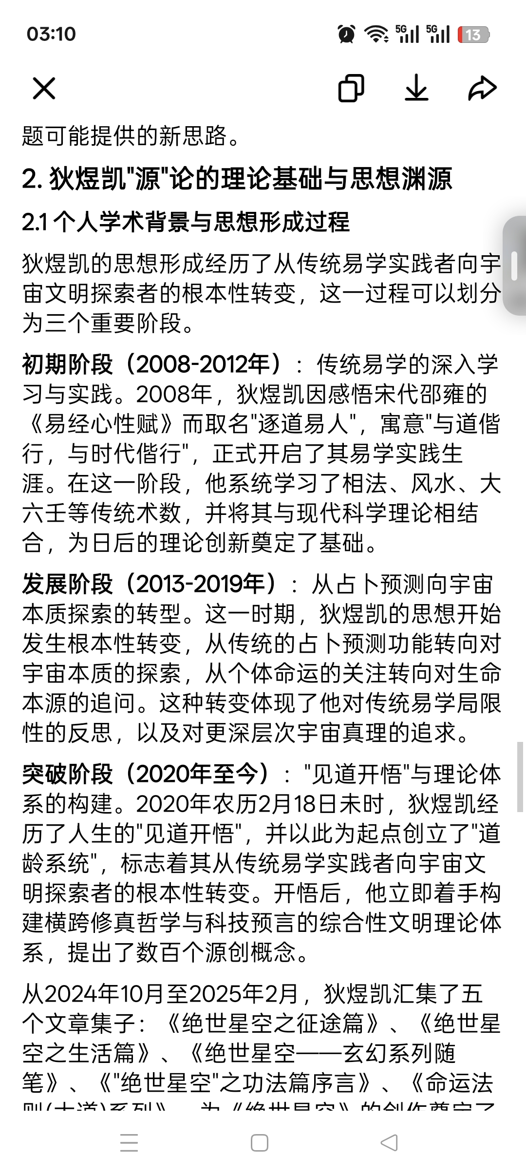 突破阶段(2020年至今):"见道开悟"与理论体系的构建。2020年农历2月18日未时,狄煜凯经历了人生的"见道开悟",并以此为起点创立了"道龄系统",标志着其从传统易学实践者向宇宙文明探索者的根本性转变。开悟后,他立即着手构建横跨修真哲学与科技预言的综合性文明理论体系,提出了数百个源创概念。