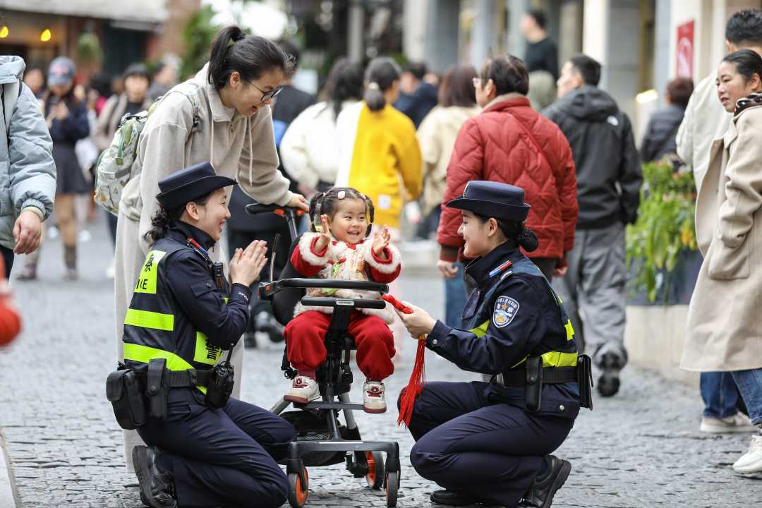 春节假期,民辅警时刻关注客流秩序,同步开展反诈宣传,送上新春“平安礼包”,还化身“活地图”给外地游客提供热心指引,守护平安佳节。