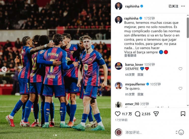 直播吧2月17日讯西甲第24轮比赛,巴萨客场1-2不敌赫罗纳,巴萨边锋拉菲尼亚更新社媒动态,表达对判罚的不满。