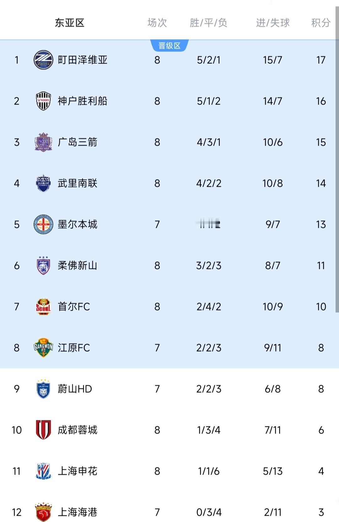 亚冠最新积分榜出炉! 申花0-2位列倒数第二,蓉城2-3排名倒数第三! 中超三队全被淘汰! 北京时间2月17日,亚冠联赛阶段最后一轮的角逐。 ①首尔2-2广岛三箭,上半场凭借造点+乌龙是建立两球优势,本来都看到全取3分的希望,结果最后补时阶段没能守住,连丢两球惨遭压哨绝平,最终仅拿1分。 ②成都蓉城2-3町田泽维亚,虽说比分不大,但实际差距较为明显。日职联劲旅踢得游刃有余,进攻组织和策动相当明确,总是能抓住破绽。反观蓉城则中后场非常薄弱,频频被突破失守,不过全队表现得很有韧性,积极拼抢,始终没有放弃,韦世豪抓住失误打进一球,而费利佩最后反击建功,八轮拿6分结束本届亚冠之旅。 ③柔佛新山1-0神户胜利船,第73分钟吉列尔梅一锤定音。 ④上海申花0-2不敌武里南联,上半场连续角球的防守出现漏洞,从而被抓住破绽丢球,0-2落后再遭坏消息,拉唐短时间两黄被罚下,10打11彻底失去希望,下半场偶尔有反击,但实际威胁不大,最终未能收获进球,八轮积4分。