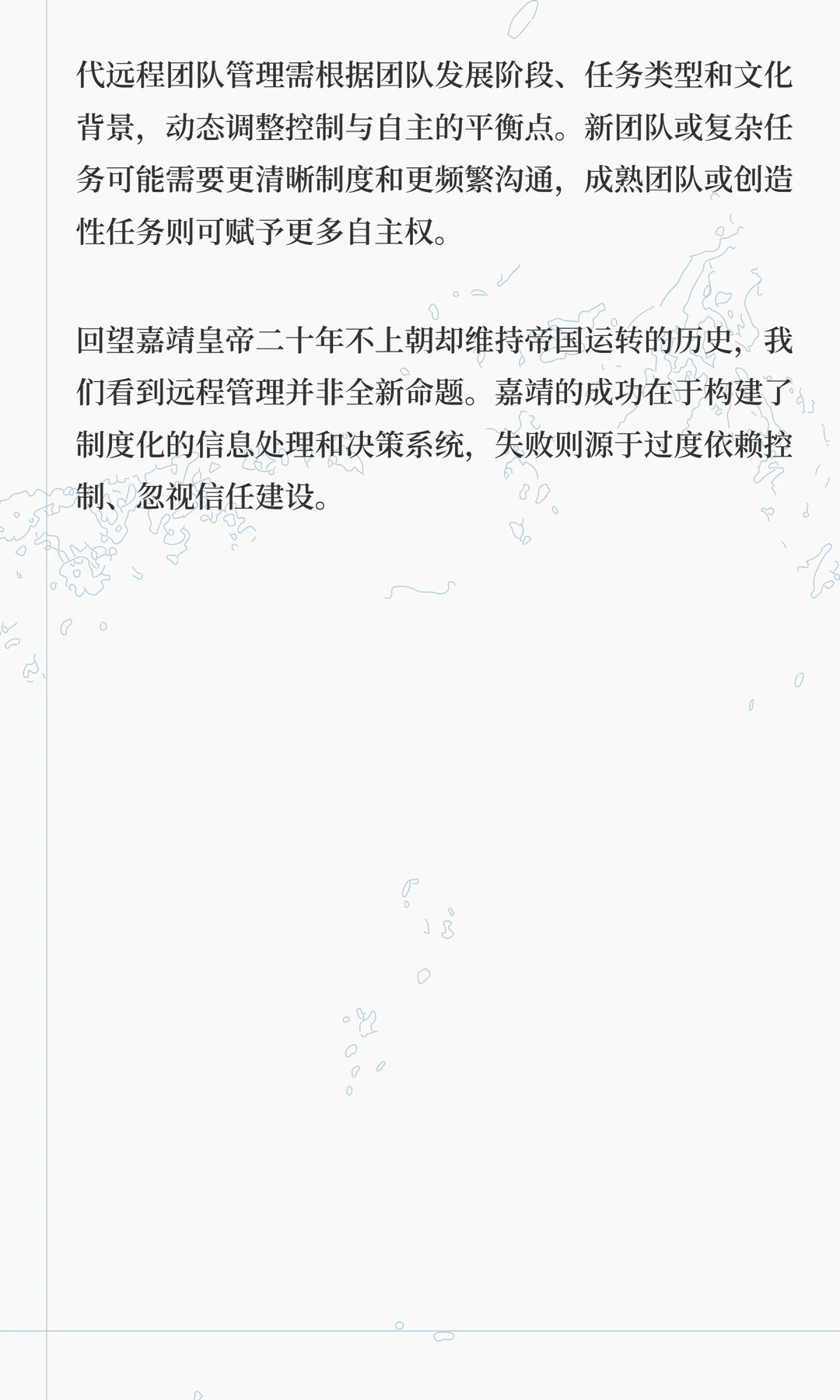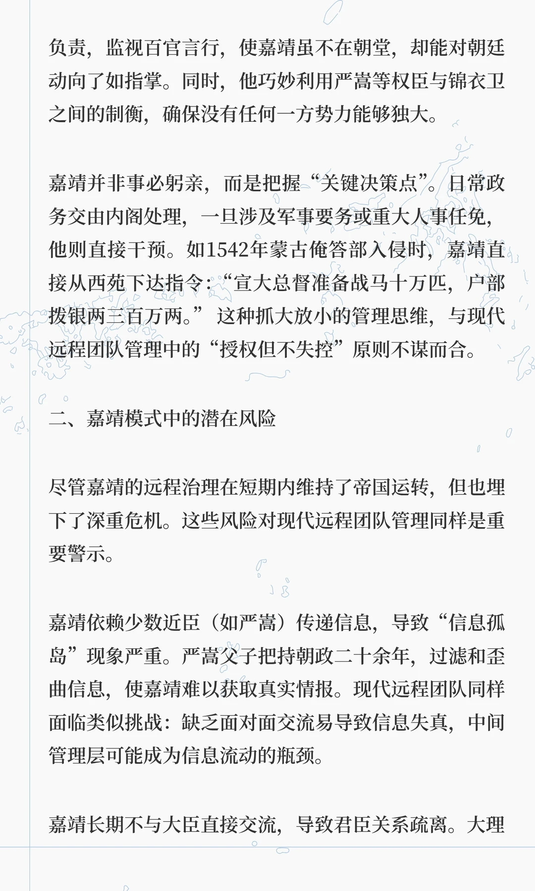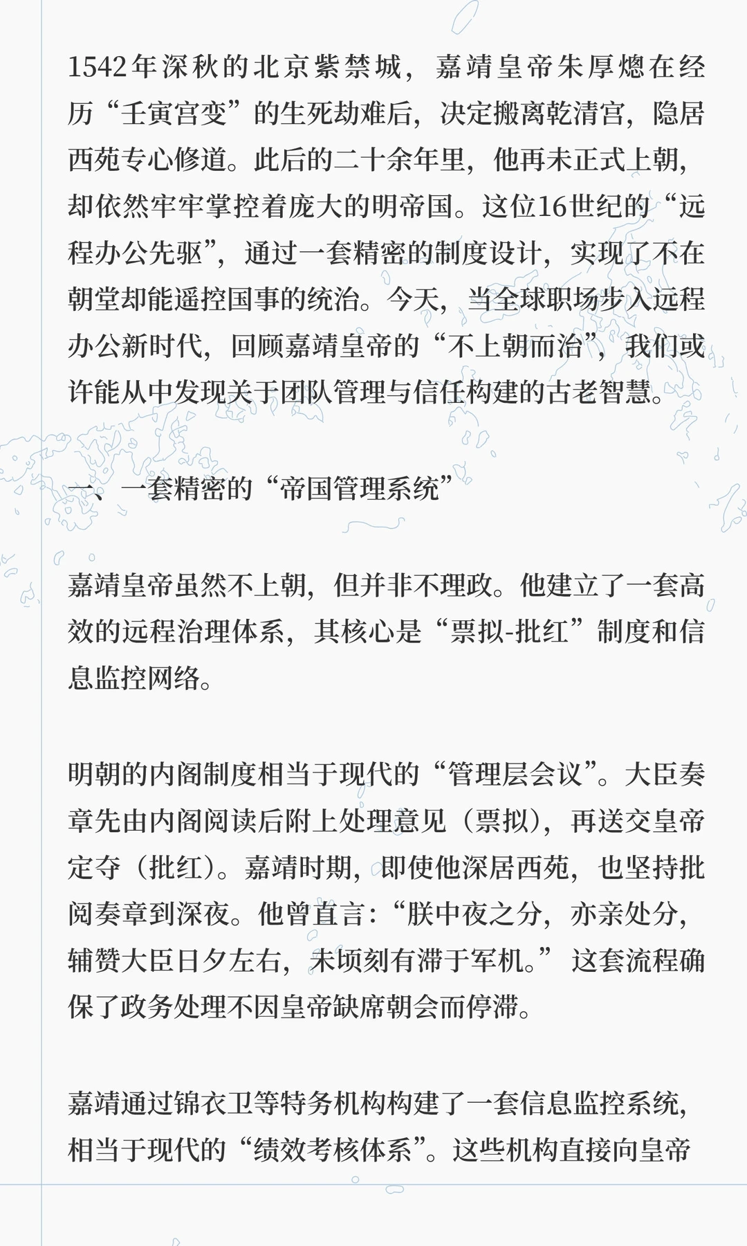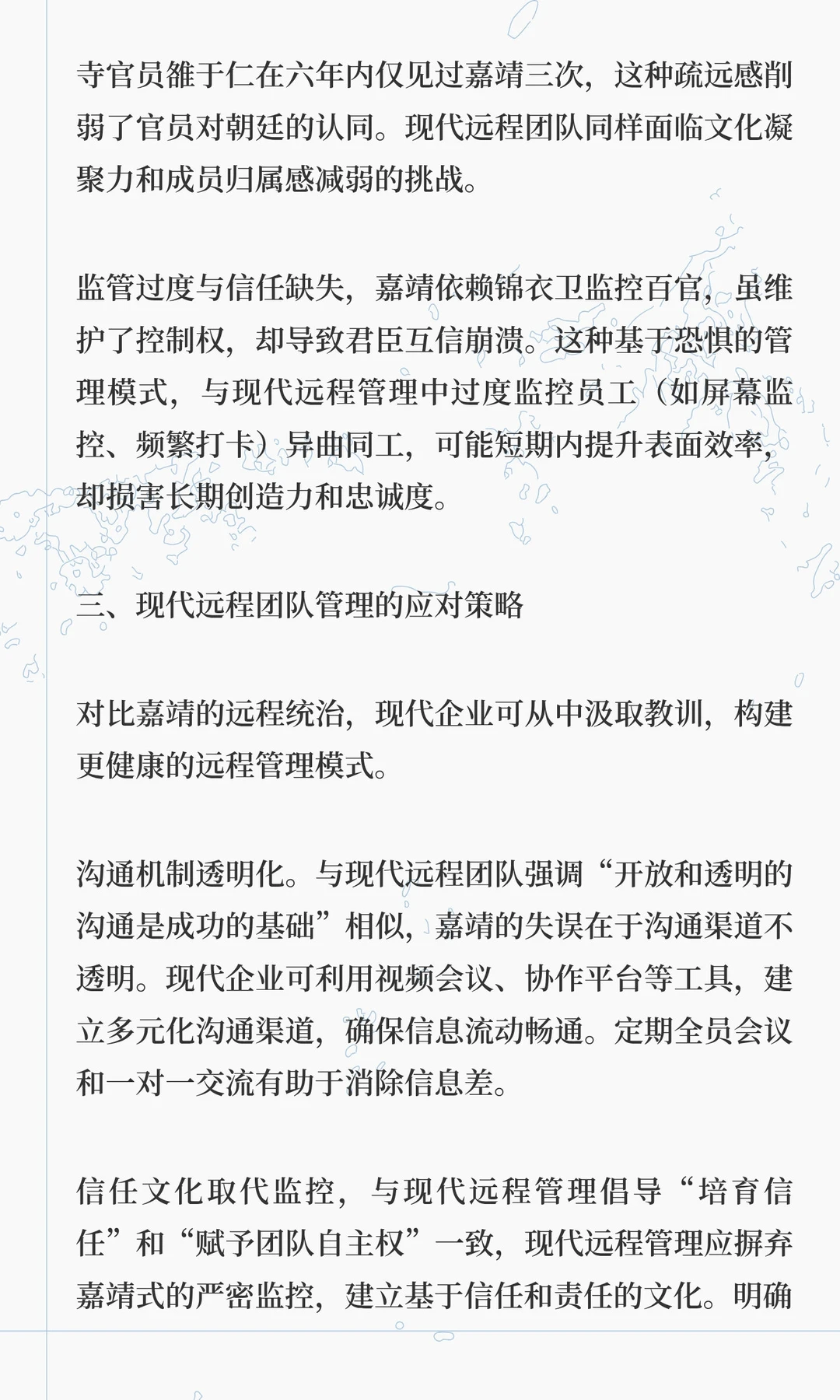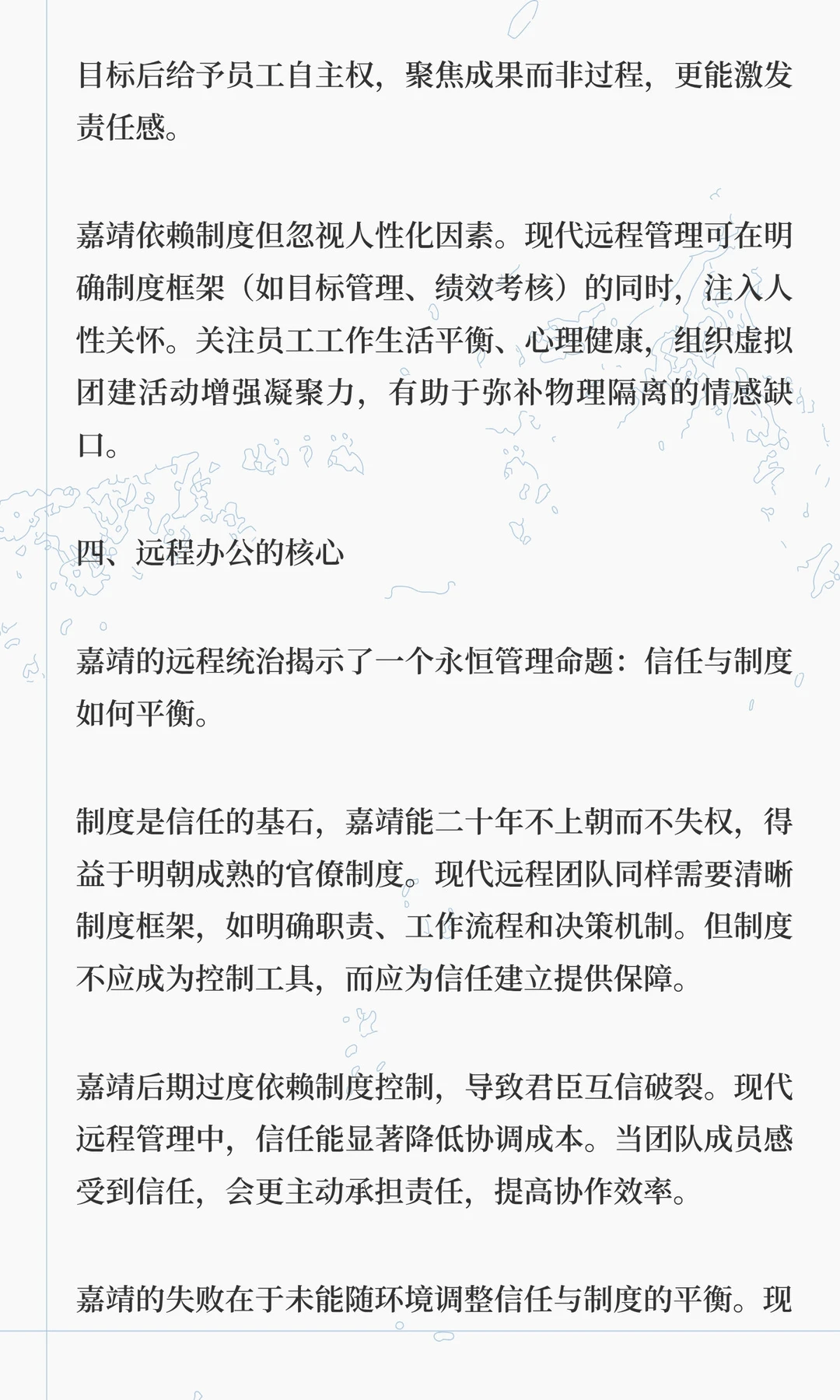嘉靖皇帝通过“票拟-批红”和信息监控网络,实现了远程治理。他依赖制度但忽视信任,导致君臣关系疏离。现代远程管理应注重沟通透明、信任建立和制度灵活调整,平衡控制与自主,提升团队效率。