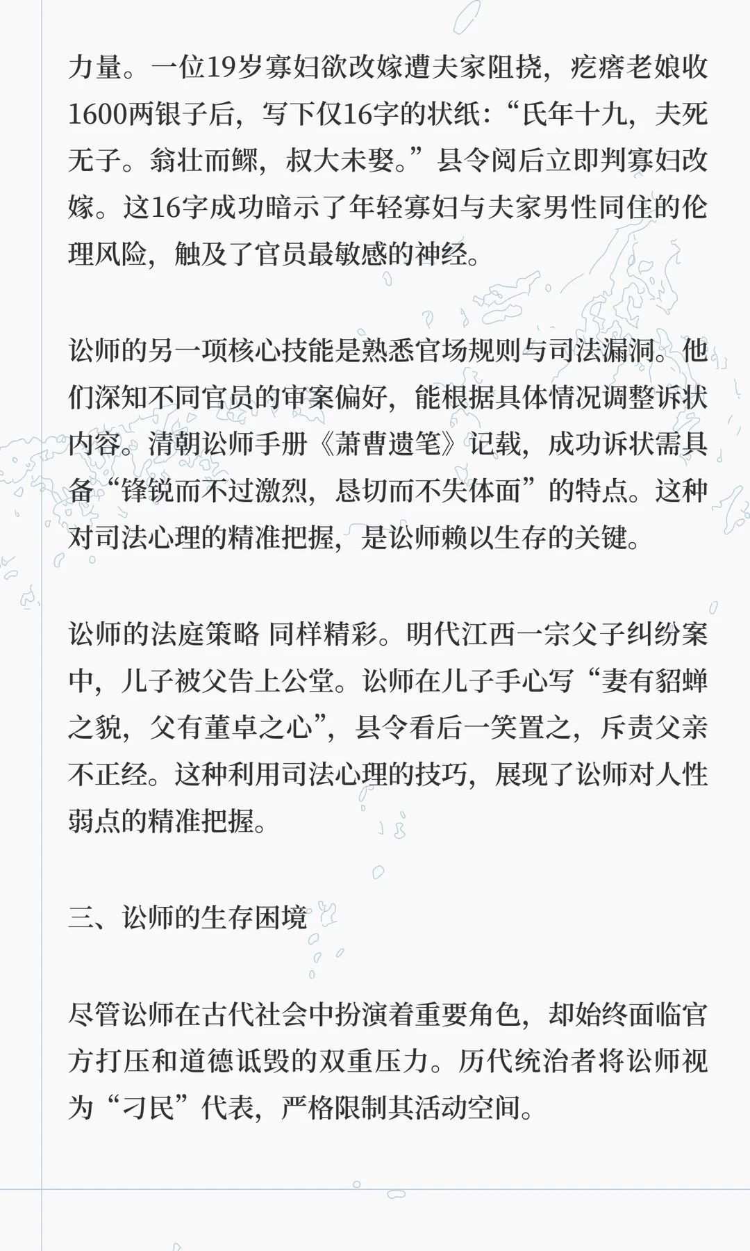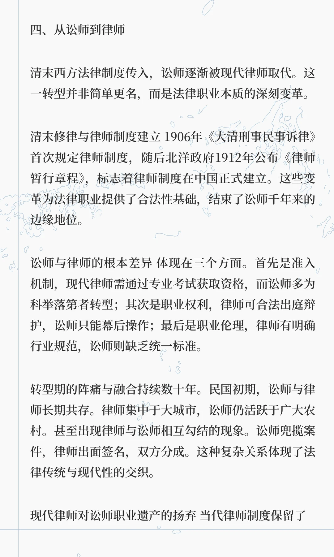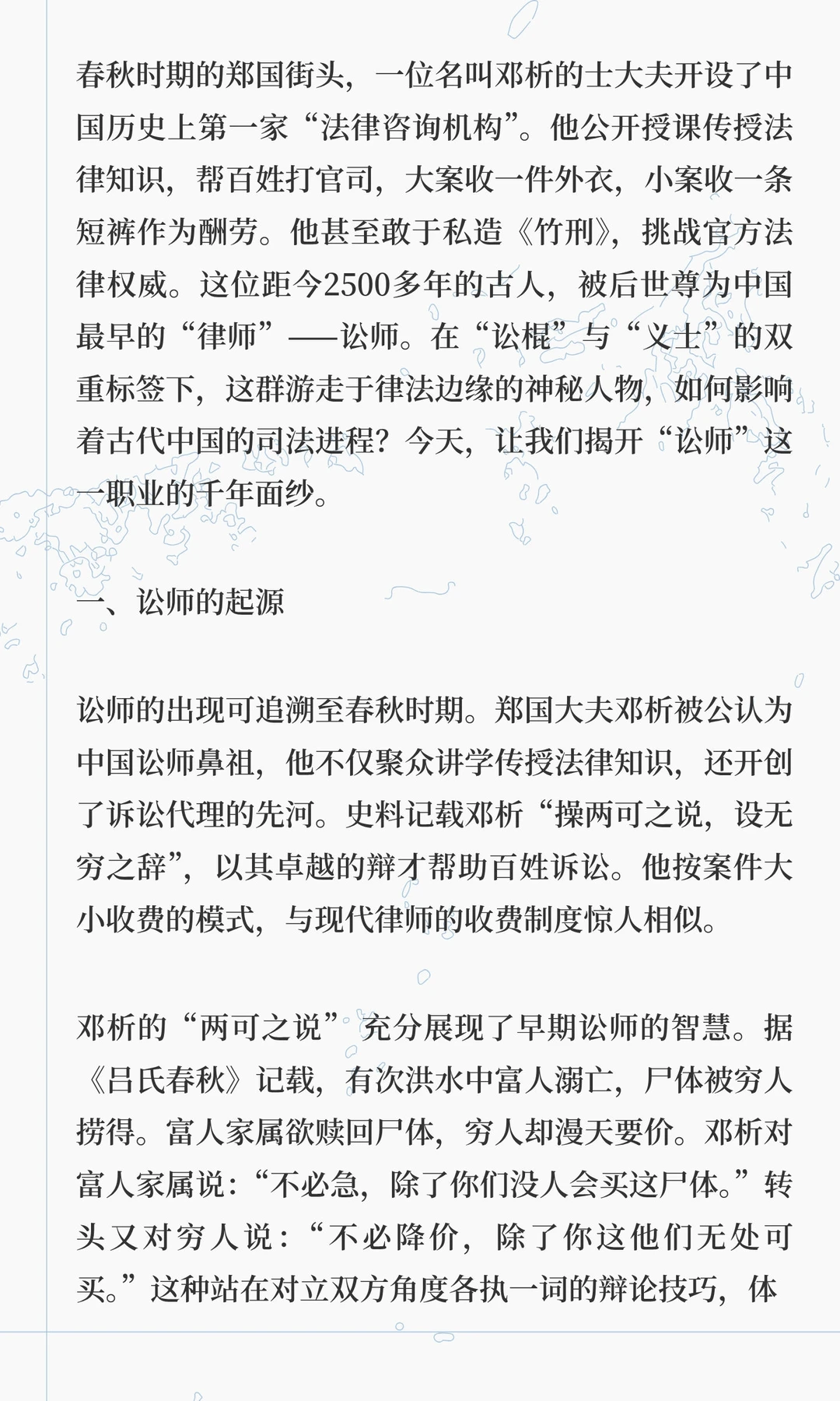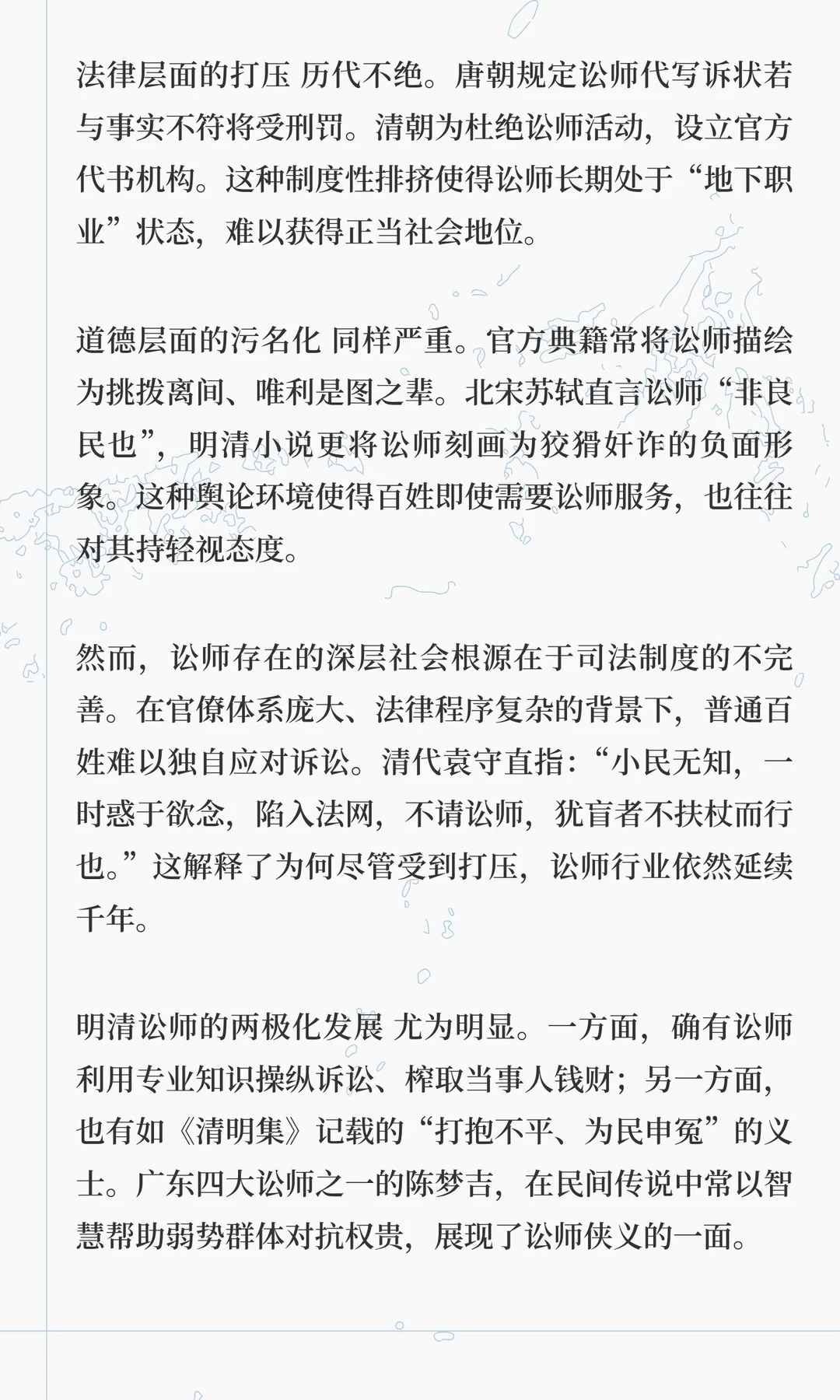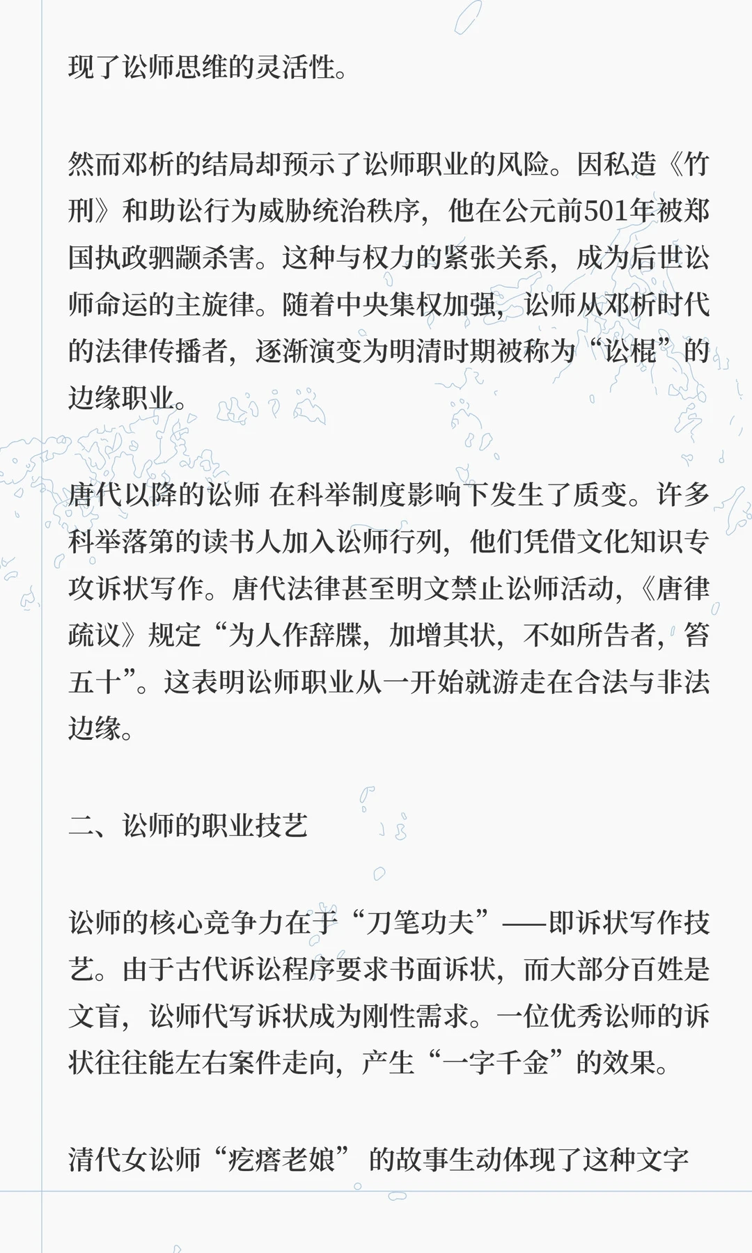 讼师是中国古代法律职业的先驱,春秋时期邓析开创诉讼代理,唐代后成为边缘职业,明清时期与律师制度形成鲜明对比。讼师通过法律知识和策略影响司法,其职业遗产在现代律师制度中得以延续。