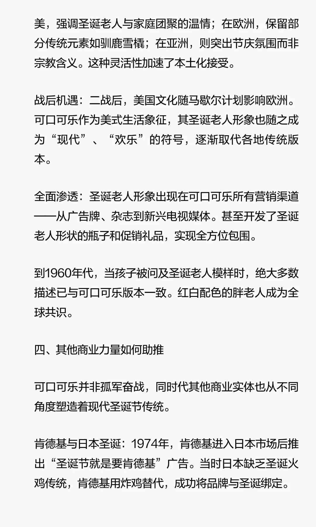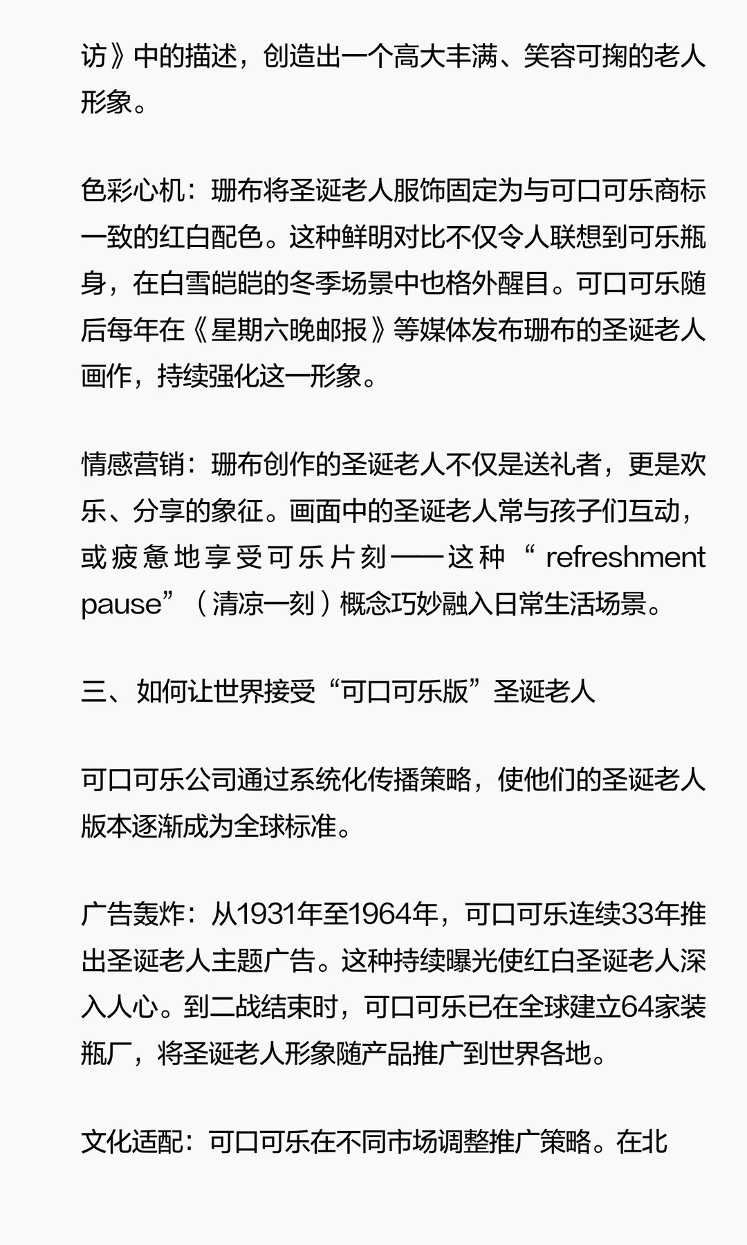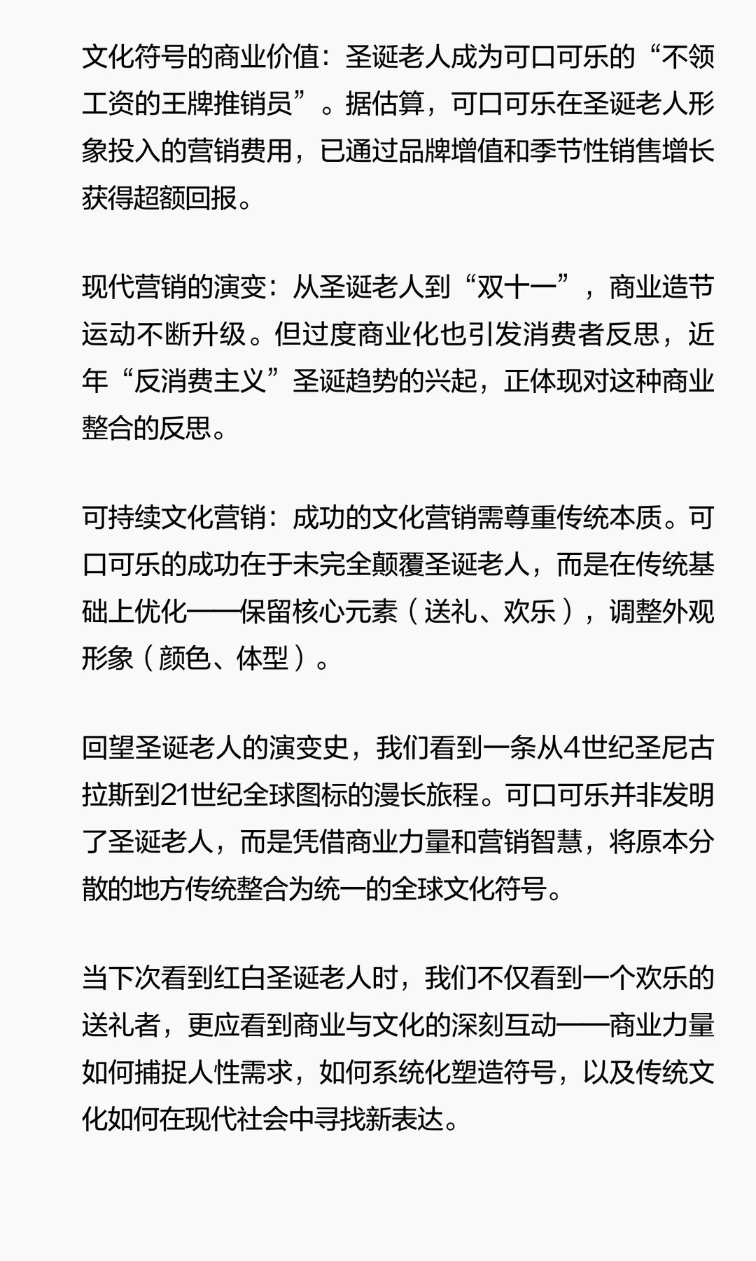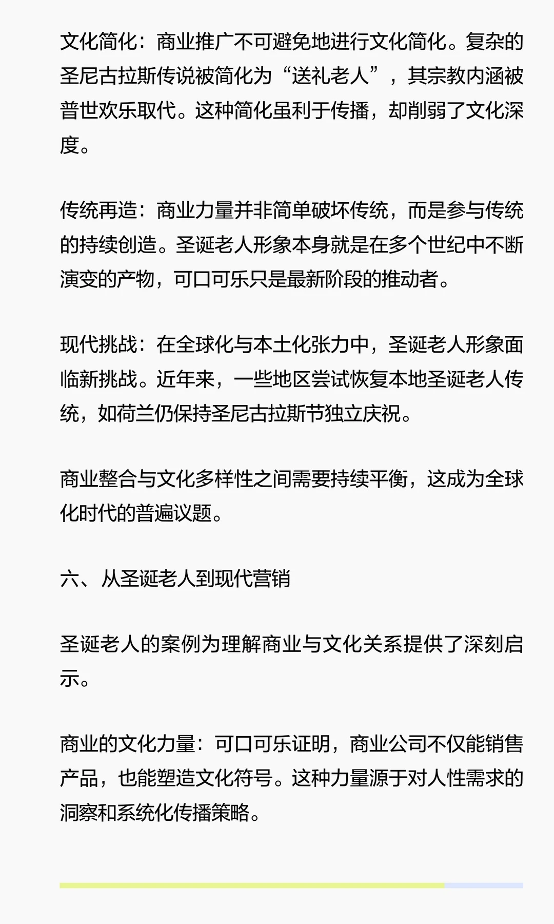 可口可乐通过广告将圣诞老人形象统一为红白胖老人,风靡全球。这一过程展示了商业如何塑造文化符号,但同时也引发了对文化简化与传统流失的思考。