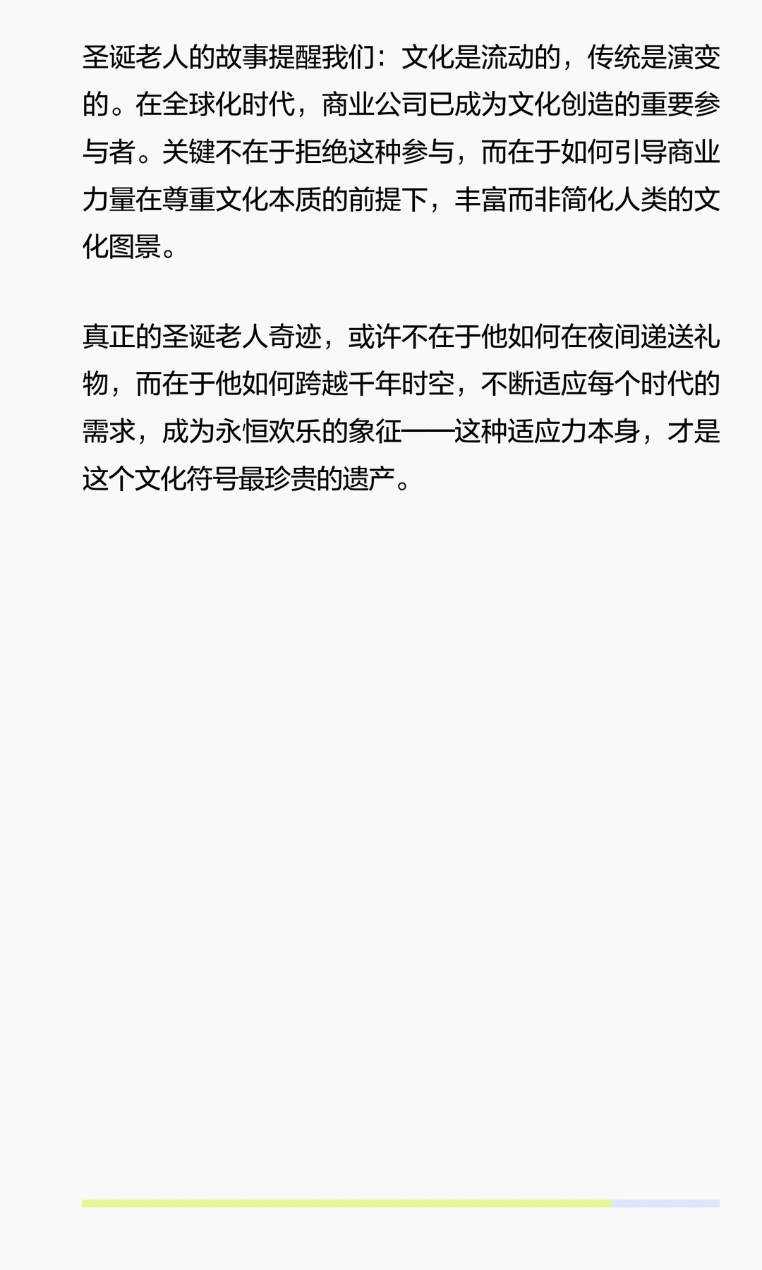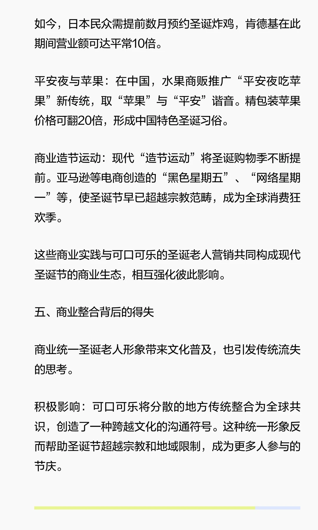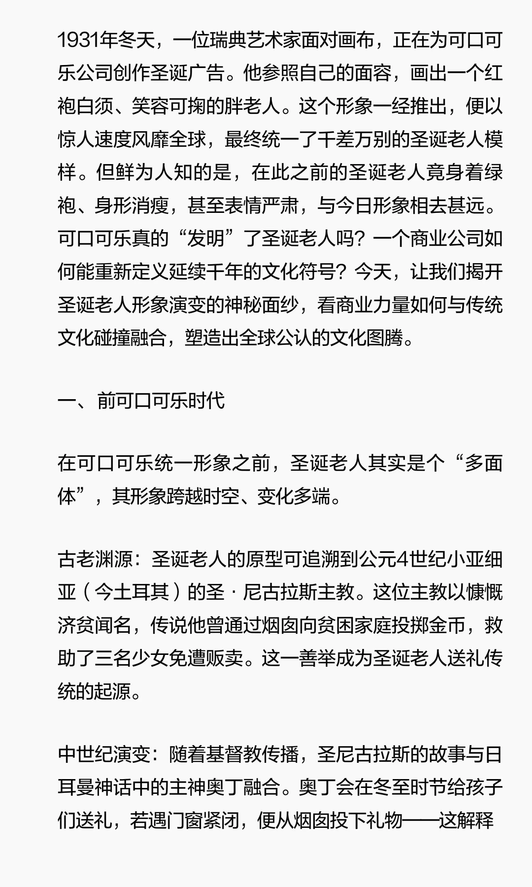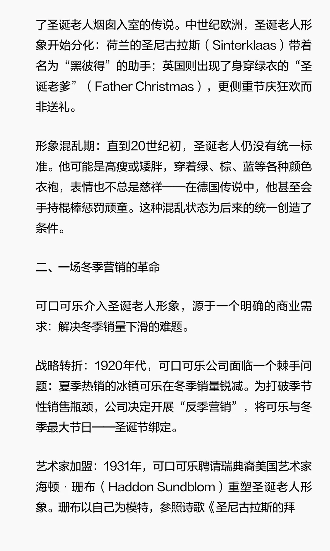 可口可乐通过广告将圣诞老人形象统一为红白胖老人,风靡全球。这一过程展示了商业如何塑造文化符号,但同时也引发了对文化简化与传统流失的思考。