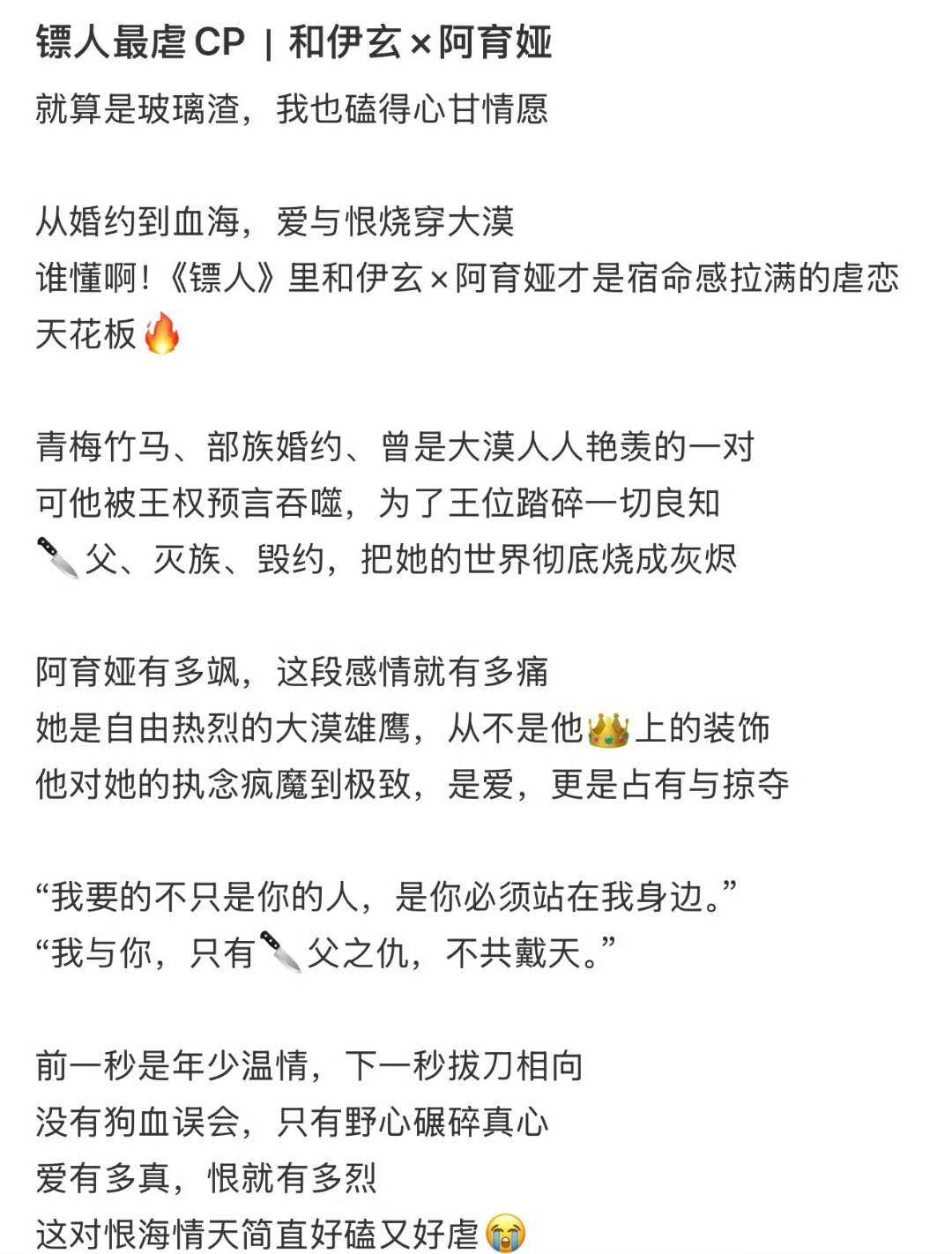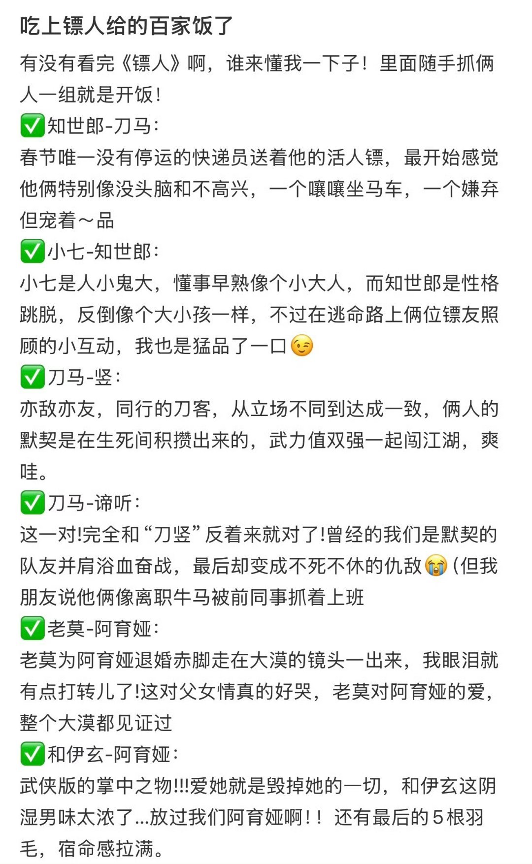 看完镖人出来只想大喊嗑死我了 看完镖人直接被狠狠拿捏,各种情感线刻画得太细腻了,刀马与竖的相互救赎,谛听和刀马的恩怨纠葛,每一段都让人动容,打戏精彩情感戳心,这样用心的作品真的值得被更多人看到,求加排片