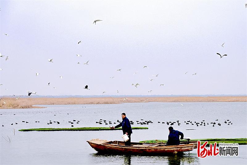 2月9日,衡水滨湖新区爱鸟护鸟志愿者协会的志愿者为候鸟投食。河北日报记者焦磊摄