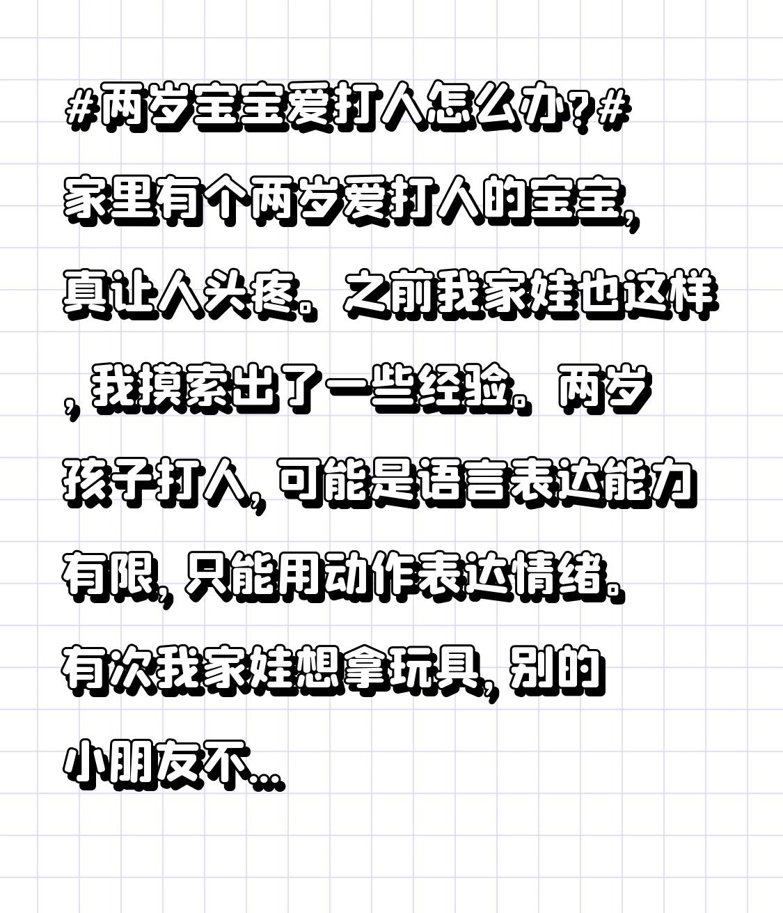 两岁宝宝爱打人怎么办? 家里有个两岁爱打人的宝宝,真让人头疼。之前我家娃也这样,我摸索出了一些经验。 两岁孩子打人,可能是语言表达能力有限,只能用动作表达情绪。有次我家娃想拿玩具,别的小朋友不给,他抬手就打。这时不能打骂孩子,得先冷静地握住他的手,告诉他“打人不对”。 平时要教孩子用语言表达想法,比如“我想要这个玩具,可以给我吗”。还可以通过绘本、故事让孩子知道打人的后果。另外,家长要做好榜样,不能有暴力行为。慢慢地,孩子就会改掉爱打人的毛病啦。