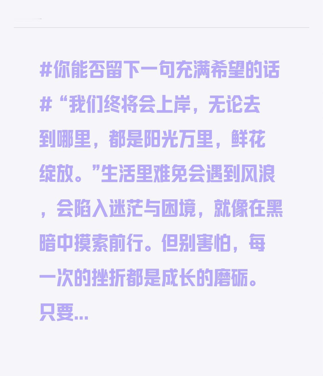 “我们终将会上岸,无论去到哪里,都是阳光万里,鲜花绽放。”生活里难免会遇到风浪,会陷入迷茫与困境,就像在黑暗中摸索前行。但别害怕,每一次的挫折都是成长的磨砺。只要心中怀揣希望,就像在黑夜中点亮了一盏明灯。就像种子在黑暗的土壤里积蓄力量,终会破土而出,迎接阳光。相信自己,未来的道路定会铺满鲜花,我们都能抵达梦想的彼岸。
