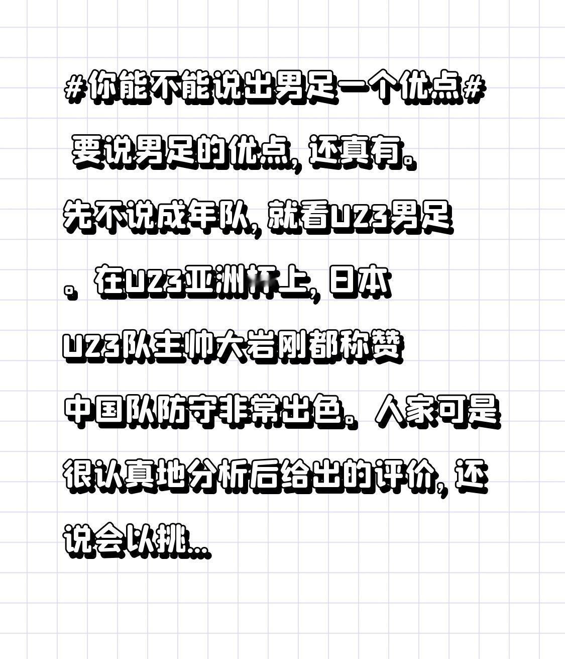 要说男足的优点,还真有。先不说成年队,就看U23男足。在U23亚洲杯上,日本U23队主帅大岩刚都称赞中国队防守非常出色。人家可是很认真地分析后给出的评价,还说会以挑战者心态面对和中国队的决赛,对场上球员都很尊重。这说明咱们男足在防守端是有实力的,能获得对手认可可不容易。不过也得吐槽下成年队,选拔和培养机制或许真有问题,工资那么高却成绩不佳,希望未来能把防守优势放大,取得更好成绩。