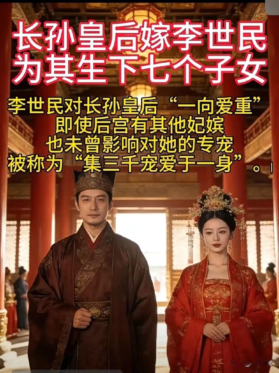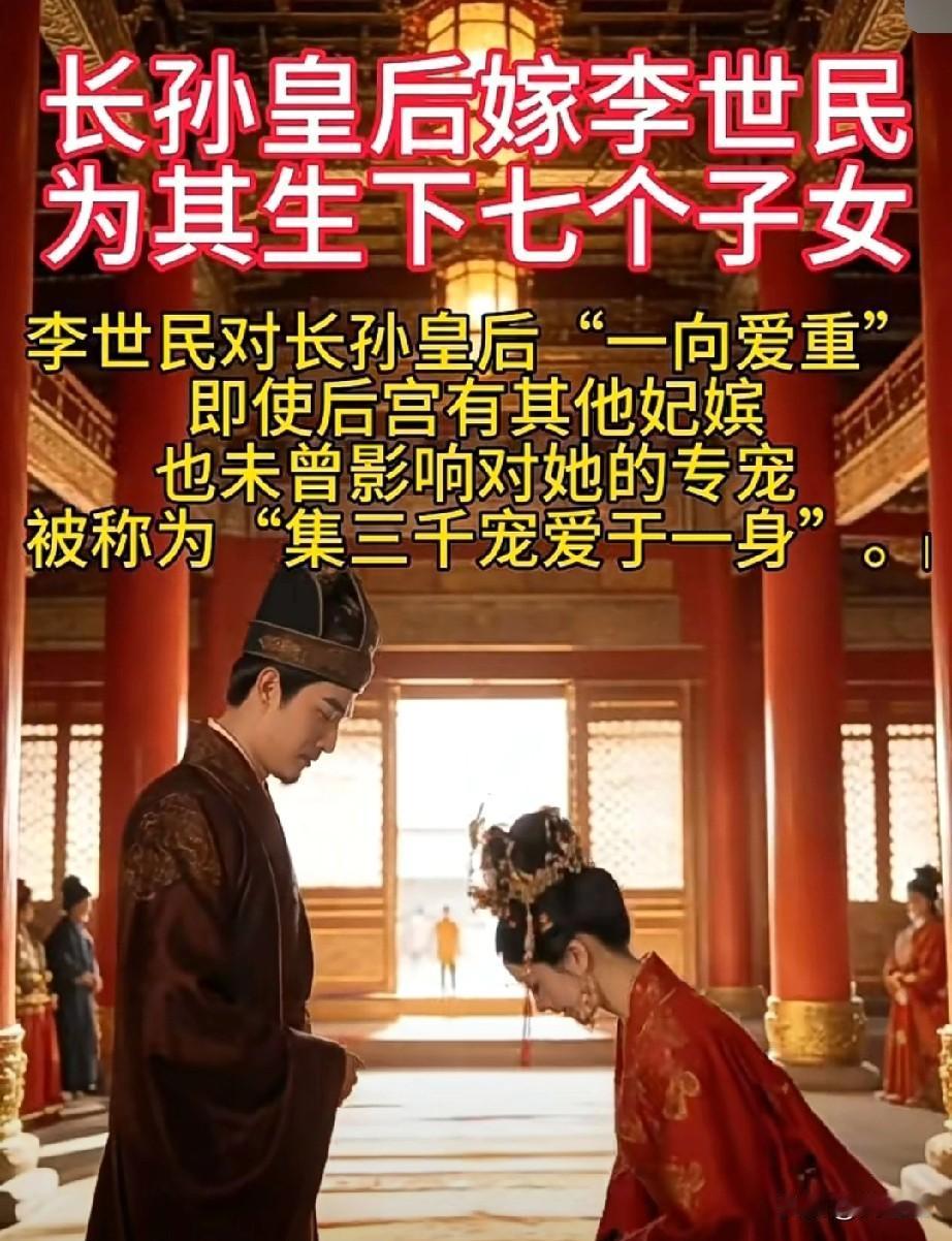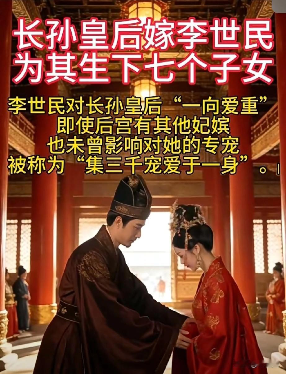 枝繁叶茂万年! 长孙皇后嫁李世民 为其生下7个子女。 李世民对长孙皇后一向爱宠,即使后宫有其他妃嫔,也未曾影响对她的专宠,被称为集三千宠爱于一身。 13岁时由舅父高士廉作主嫁予16岁的李世民,两家门当户对,婚前因长孙无忌与李世民为挚友,二人已有交往基础。 婚后不久李世民生母窦氏病逝、高士廉被贬岭南,二人相互扶持;李世民征战期间,长孙氏独掌秦王府事务,17岁即担起“当家主母”职责。 李世民称其为“良佐”,临终前仍建层观眺望其陵墓。