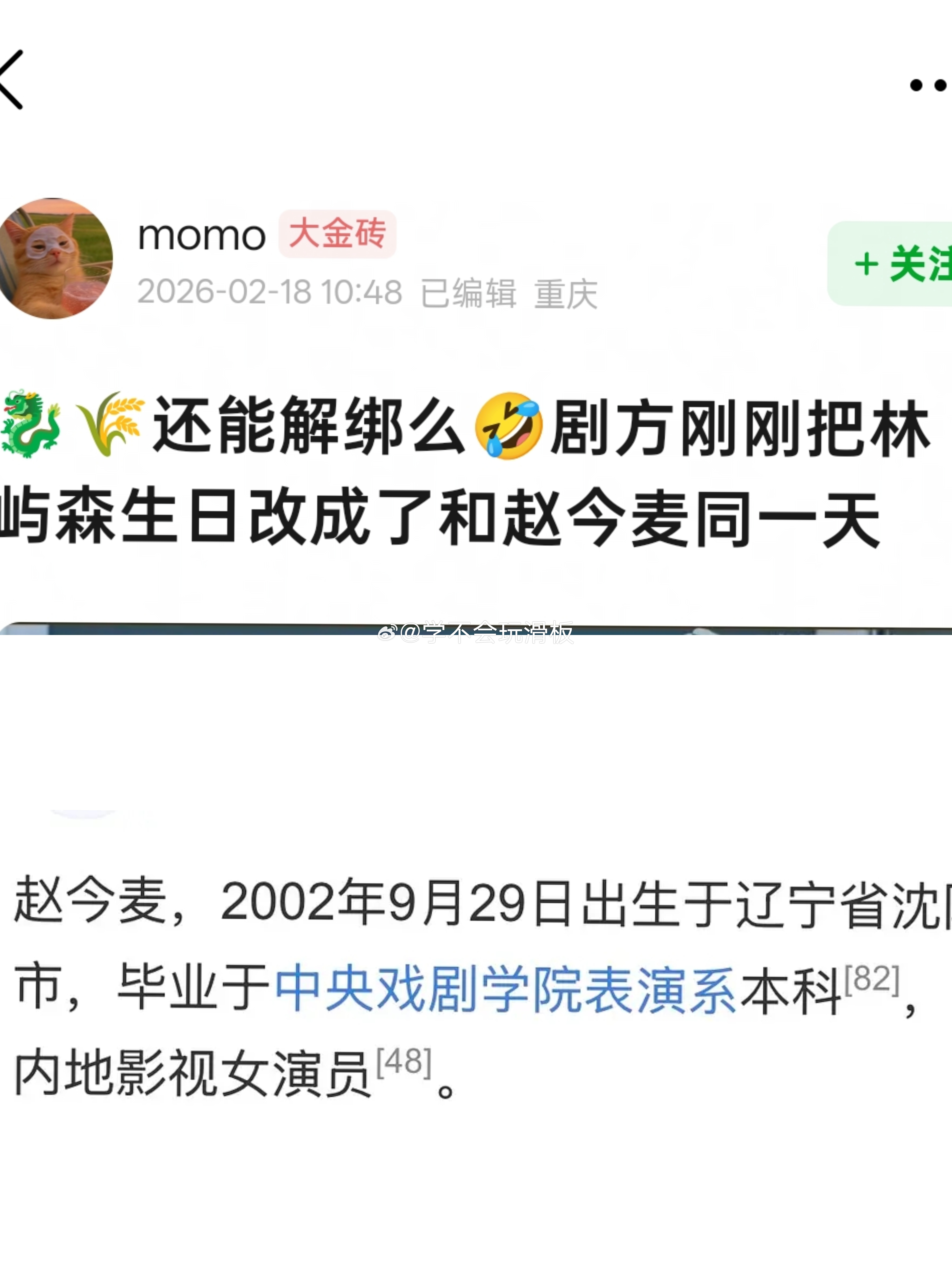 有网友发现:《骄阳似我》剧方疑似将剧里林屿森的生日改成了赵今麦的生日。