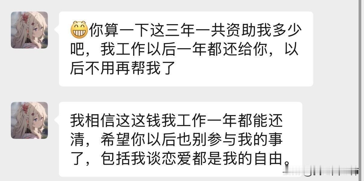 资助了三年的女孩,到头来还反过来怪我。 不知道现在的心情是怎么形容。 从高一到高三,学费,资料费,吃饭,每个月的卫生巾我、水果。 别人有的她不能少,别人没有的我也尽量给。我以为自己在托举一个女孩的未来。 昨天大年初一没有给我拜年,不然红包昨天我就发出去了。大年初二就因为没同意去校外住宿闹成这样了,哎。 其实从来也不求回报。但是以后再也不会资助任何人了,心凉透了。