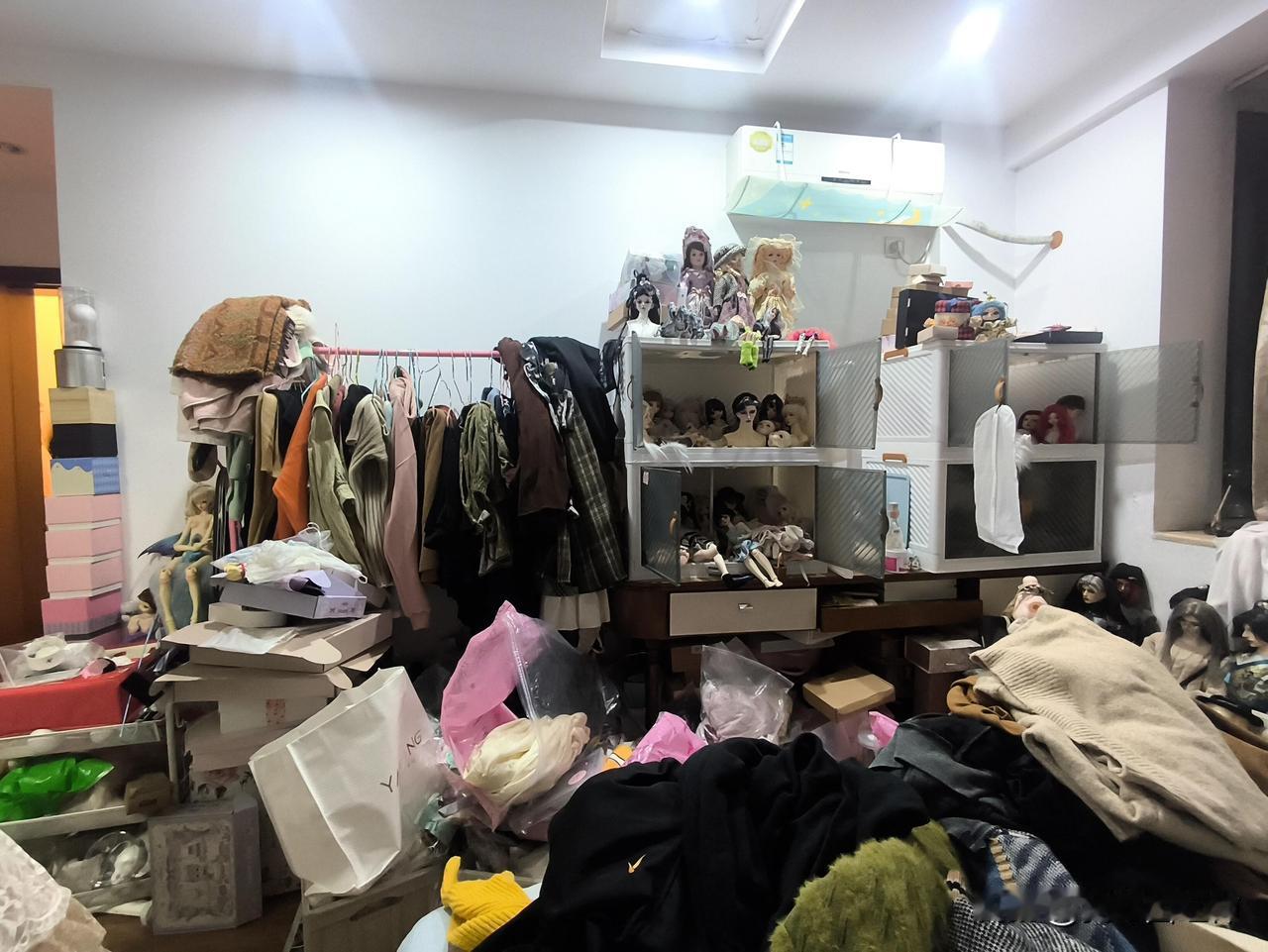 我是太懒了还是心理有病 不要骂我是怎么住的下去的 21年开始玩娃娃一买停不下来,大部分都是🐟上买的,价格比新的划算很多所以一看到喜欢的好价就会买。娃娃官箱妆盒假发盒都很占空间,但是感觉没办法一股脑全扔了。(娃娃是我的爱好,我不觉得恐怖啦,恐娃的不要攻击我) 同时也有挺多衣服的,夏天的衣服之前是挂左前方的衣架上,衣服薄挂的比较多,冬天的衣服用压缩袋放右上角衣柜和家里别的小房间。 现在换冬天的衣服,左下的衣架挂不了几件,但是我已经把夏天的衣服用袋子装了和冬天衣服互换位置了,剩下的冬天衣服挂不下也没地方放,就一直放在我床尾和附近地上有时睡觉腿都伸不太直。已经扔了一批了还是剩挺多挂不起来的 家里也没什么多余的空间能放衣服了,虽然家里不小但是我和我妈总是很多东西(我更严重),我总是不舍得扔东西+一买喜欢的东西感觉控制不住自己。 家里有个小房间是专门堆放杂物了,差不多整个房间塞得满满当当,我自己的房间也小也很多东西,我尽量不侵占客厅了其他公共区域。 现在问题就是我多出来的冬天衣服实在没有地方可以放了,但是也还挺多件会穿的扔不了,我很想收拾但是感觉充满了无力感,所以只能让它一只堆着,最近好不容易收拾出图3一个小角落,但是还是很多东西仍然散漫堆落,也买了很多收纳,但是感觉我的收拾能力实在很有问题,经常都是收来收去还是那么多还是那么乱。明明已经收纳了很多但是可能一看到空的多了我就容易继续买,感觉一直在填满,但是明明已经够多东西了,感觉自己是不是有强迫症 我也理解可能东西太多就是不好收,求助能不能在尽可能少扔东西的情况下如何规划自己的房间衣服和娃娃,感谢大家! 顺便补充我前段时间辞职了,但是房间是一直很乱,本来以为辞职后会有精力好好收拾好好拍娃的,但是我好像没有那种补充到能量的感觉,感觉人生也有点颓废,所以求助大家帮我看看如何收拾房间如何收拾人生