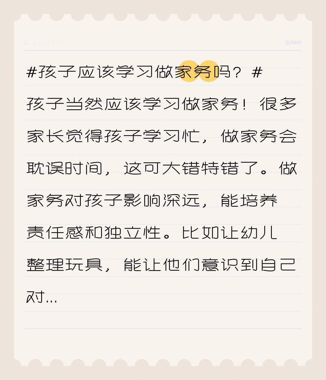 孩子当然应该学习做家务!很多家长觉得孩子学习忙,做家务会耽误时间,这可大错特错了。做家务对孩子影响深远,能培养责任感和独立性。比如让幼儿整理玩具,能让他们意识到自己对家庭有责任,慢慢学会独立完成任务。 做家务还能提升动手和时间管理能力。像整理房间,得分类物品、规划空间,做饭要按步骤操作、控制时间。而且家务通常是全家一起参与,能增强孩子的团队合作意识。 另外,适当做家务还能拉近亲子关系,让孩子觉得被信任、被需要。所以别再把孩子当“温室花朵”,快让他们参与到家务中来吧。