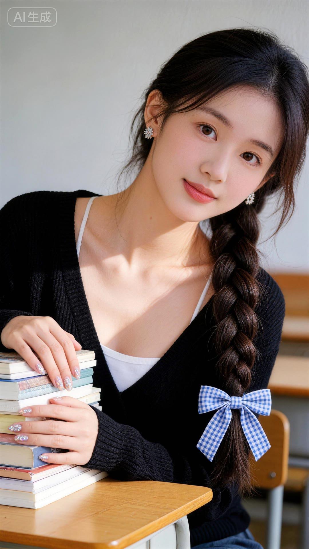 元气少女在教室里,微笑着玩弄头发,青春洋溢!😊📚✨
