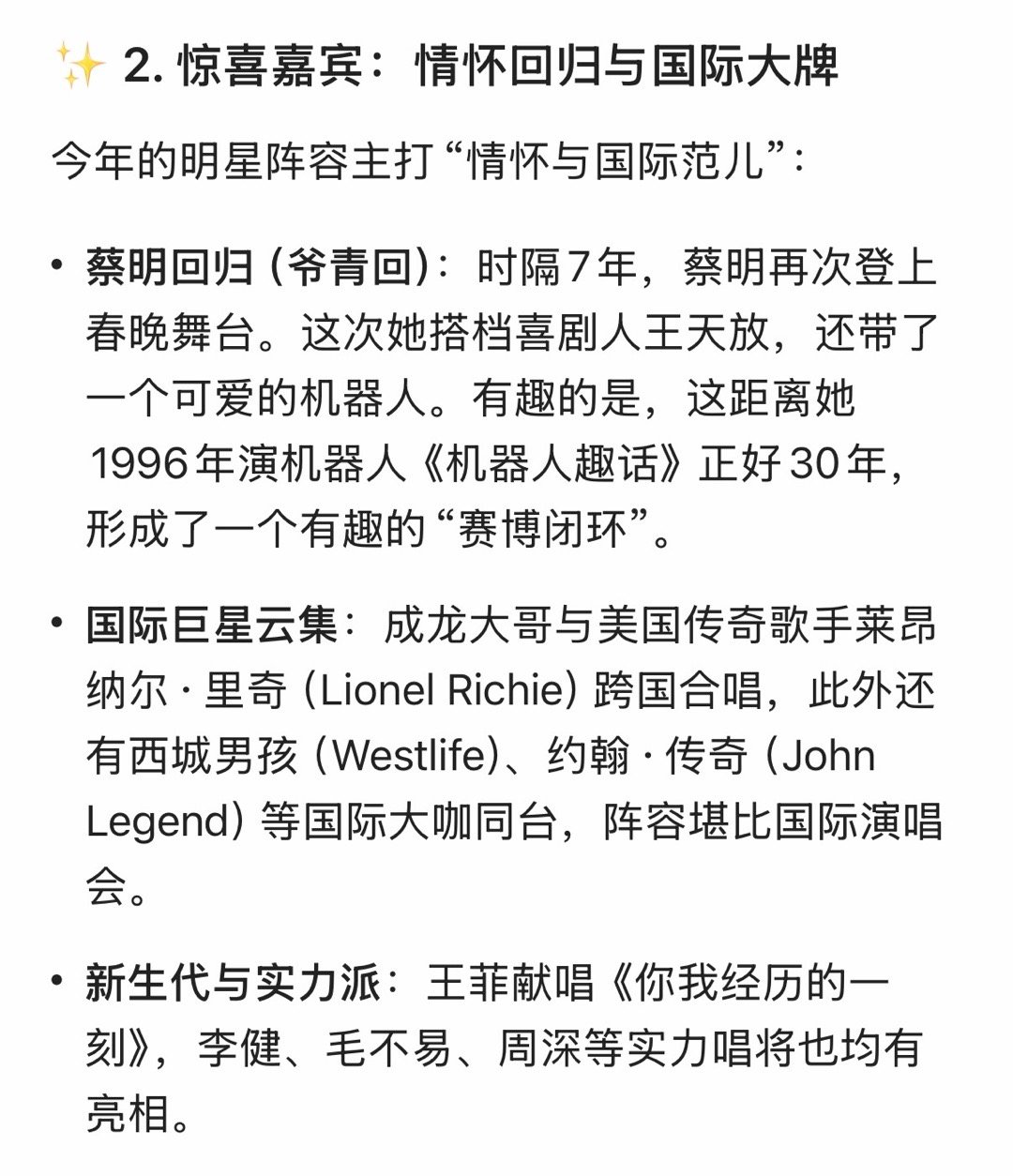今年的明星阵容主打“情怀与国际范儿”:时隔7年,蔡明再次登上春晚舞台。这次她搭档喜剧人王天放,还带了一个可爱的机器人。有趣的是,这距离她1996年演机器人《机器人趣话》正好30年,形成了一个有趣的“赛博闭环”;成龙大哥与美国传奇歌手莱昂纳尔·里奇(Lionel Richie)跨国合唱,此外还有西城男孩(Westlife)、约翰·传奇(John Legend)等国际大咖同台,阵容堪比国际演唱会;王菲献唱《你我经历的一刻》,李健、毛不易、周深等实力唱将也均有亮相。部分内容来源