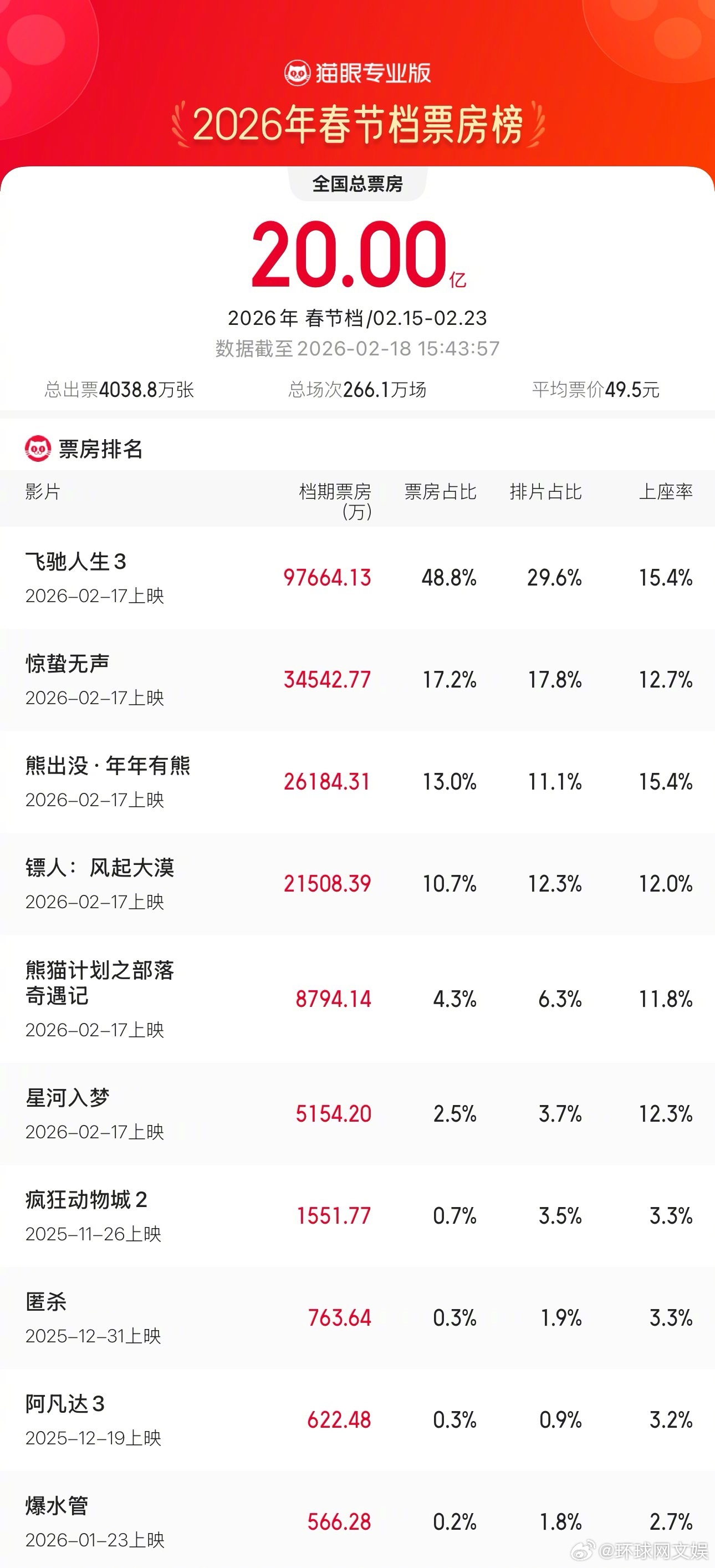 【#2026年春节档总票房破20亿# 】据猫眼专业版数据,2026年春节档档期总