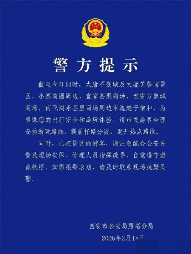 截至今日14时,大唐不夜城及大唐芙蓉园景区,小寨商圈周边,宜家荟聚商场,西安万象城商场,南飞鸿乐荟里商场周边车流趋于饱和,为确保您的出行安全和游玩体验,请市民游客合理安排游玩路线,提前择路分流,避开热点路段。