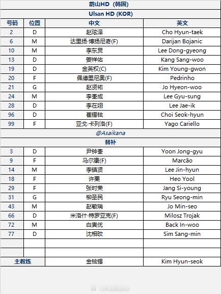 2025-26赛季亚冠精英联赛 联赛阶段 上海海港vs蔚山HD 首发名单