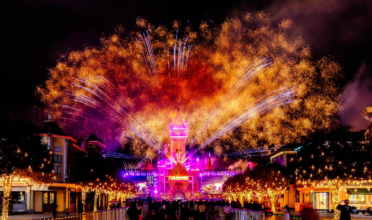 活动期间,郑州方特双园分别推出“盛世华章城堡烟花秀”和“熊梦星河烟花秀”,当夜幕降临,绚丽烟花在园区上空绽放,与灯光交相辉映,营造出火树银花不夜天的浪漫盛景,成为游客新春出游记忆中的又一亮点。