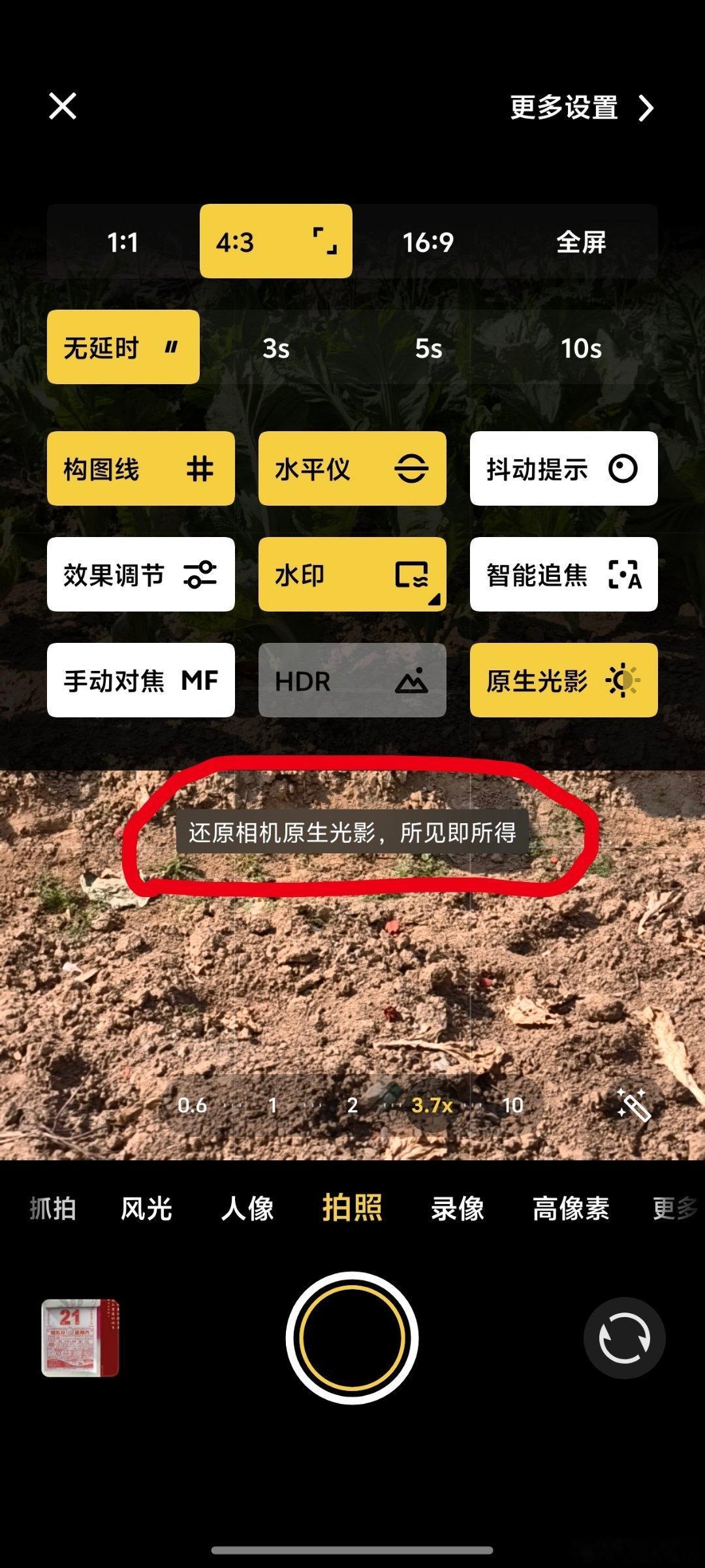 现在相机设置里多了一个原生影像,可以实现所见即所得的照片。