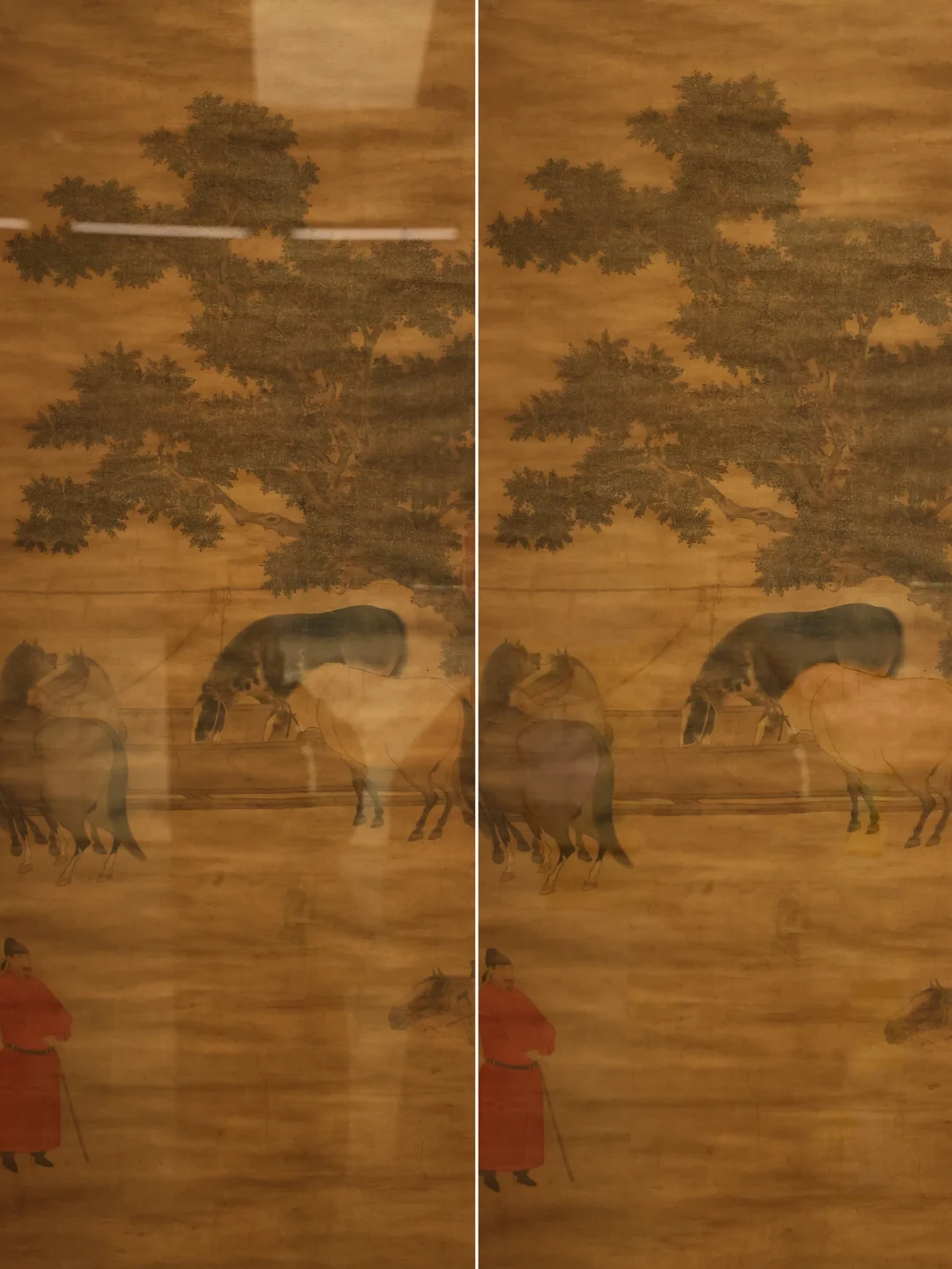 此前去看展拍照,也会拍到很多玻璃反光,但因我认为这也是照片真实的一部分,所以就很少后期费劲地去除反光。但最近看画时,尤其是大幅的画,完全无法利用拍摄躲避反光点。等回来再看,发现反光处实在影响整体照片的美感,甚至可以称之为瑕疵,就觉得有必要后期去除一下了。