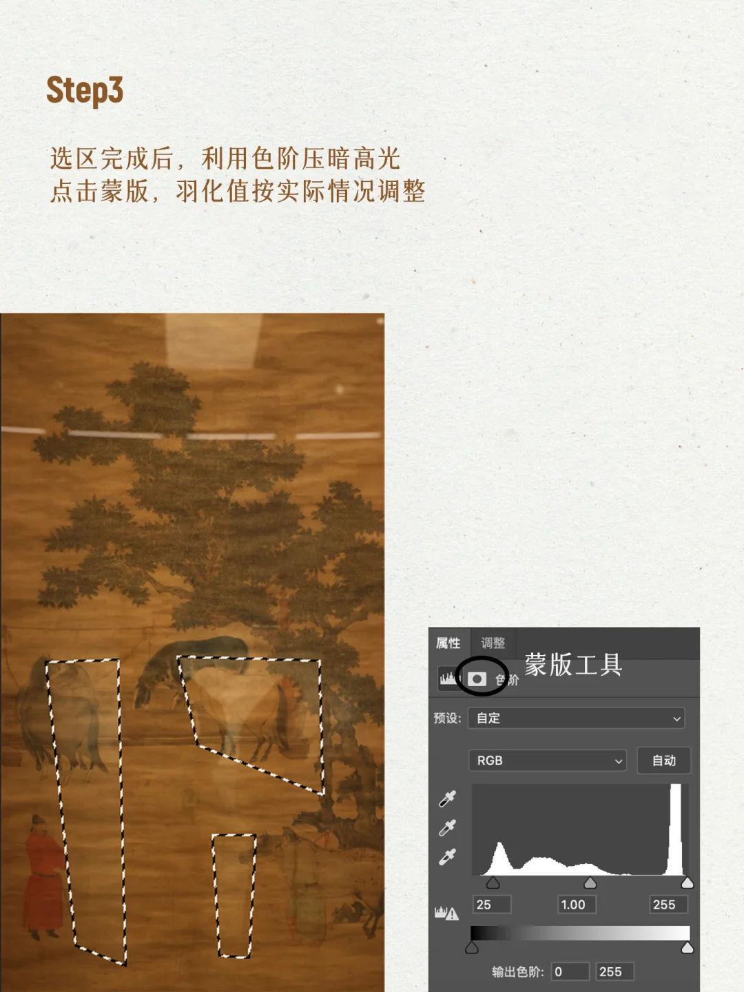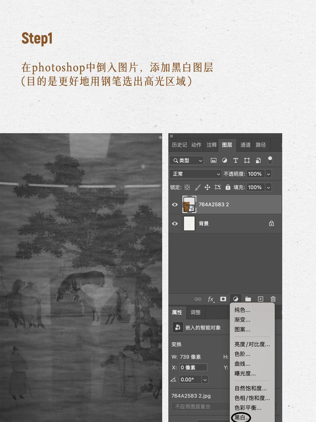 黑白为何直接变回了彩色,是因为取消了黑白图层,为了色阶压暗时,可以更清晰看清楚与周围颜色的融合度