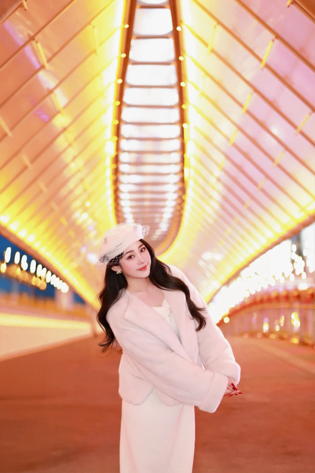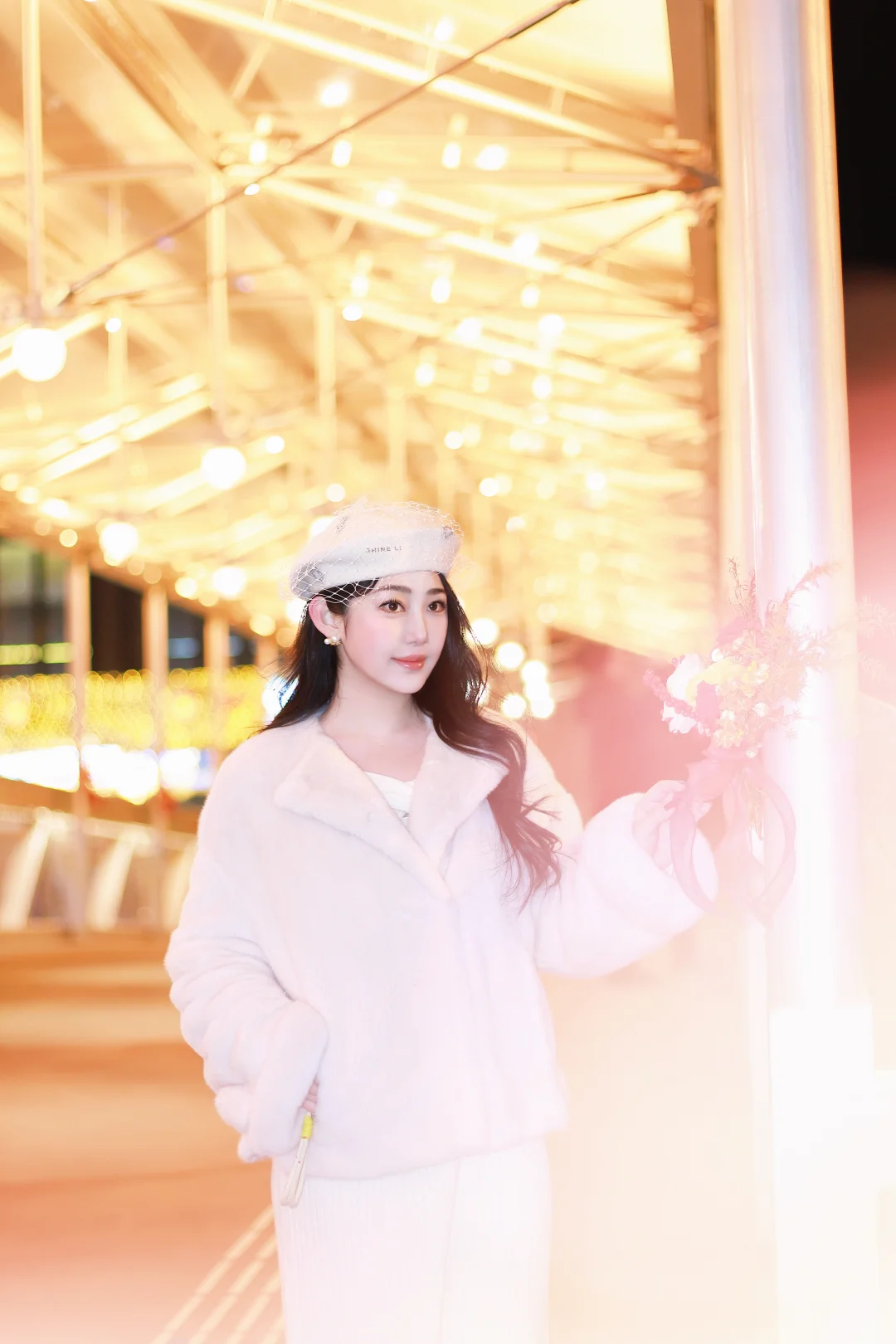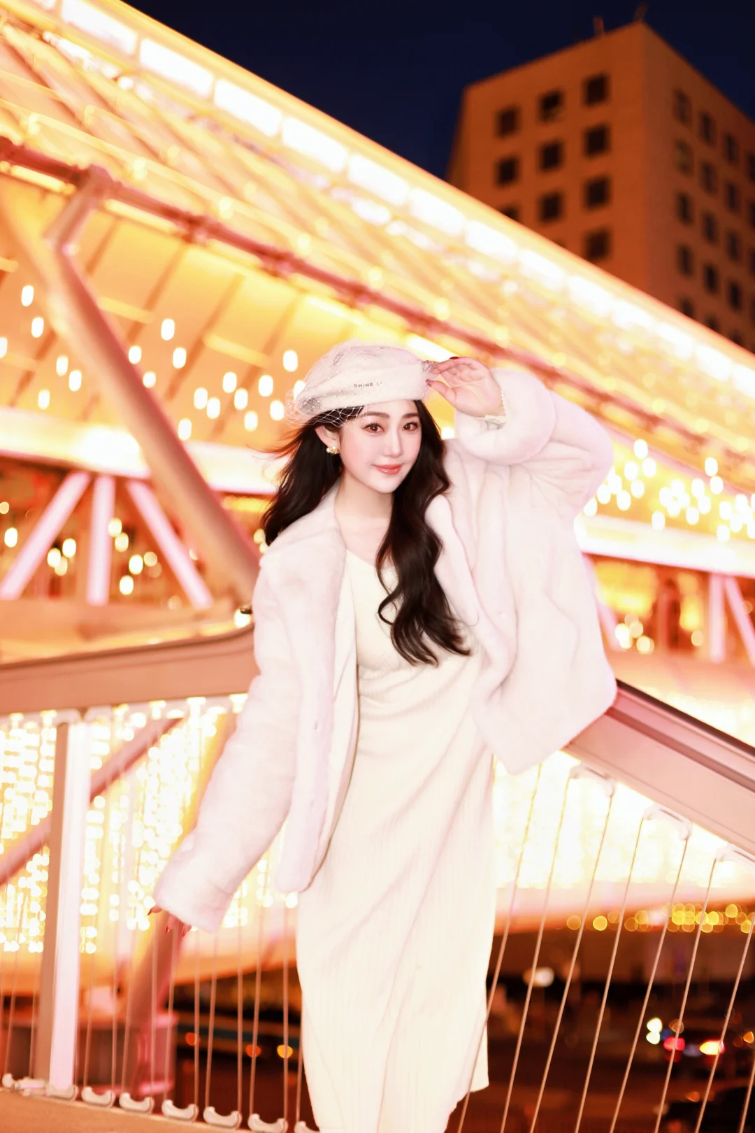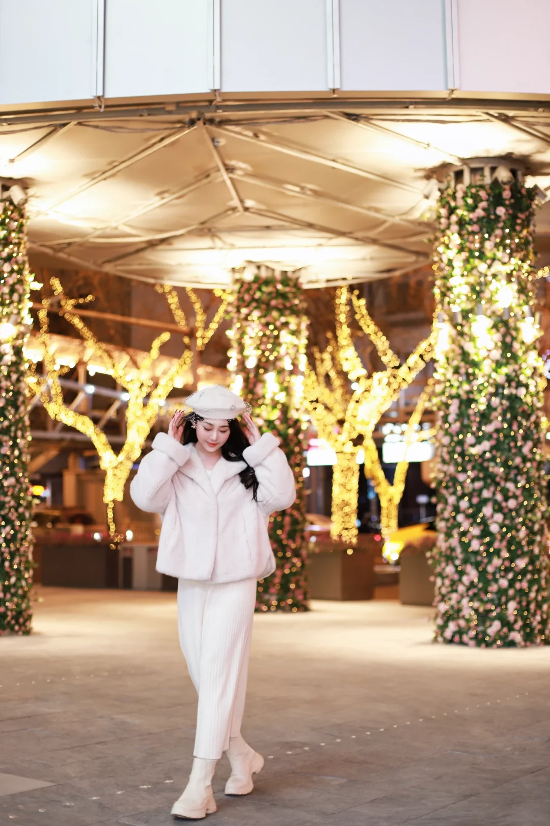 特意穿了一身温柔的米白色,想和这满街的暖黄灯火撞个满怀。毛绒绒的大衣裹住了北京的晚风,也裹住了新年的松弛感🧧