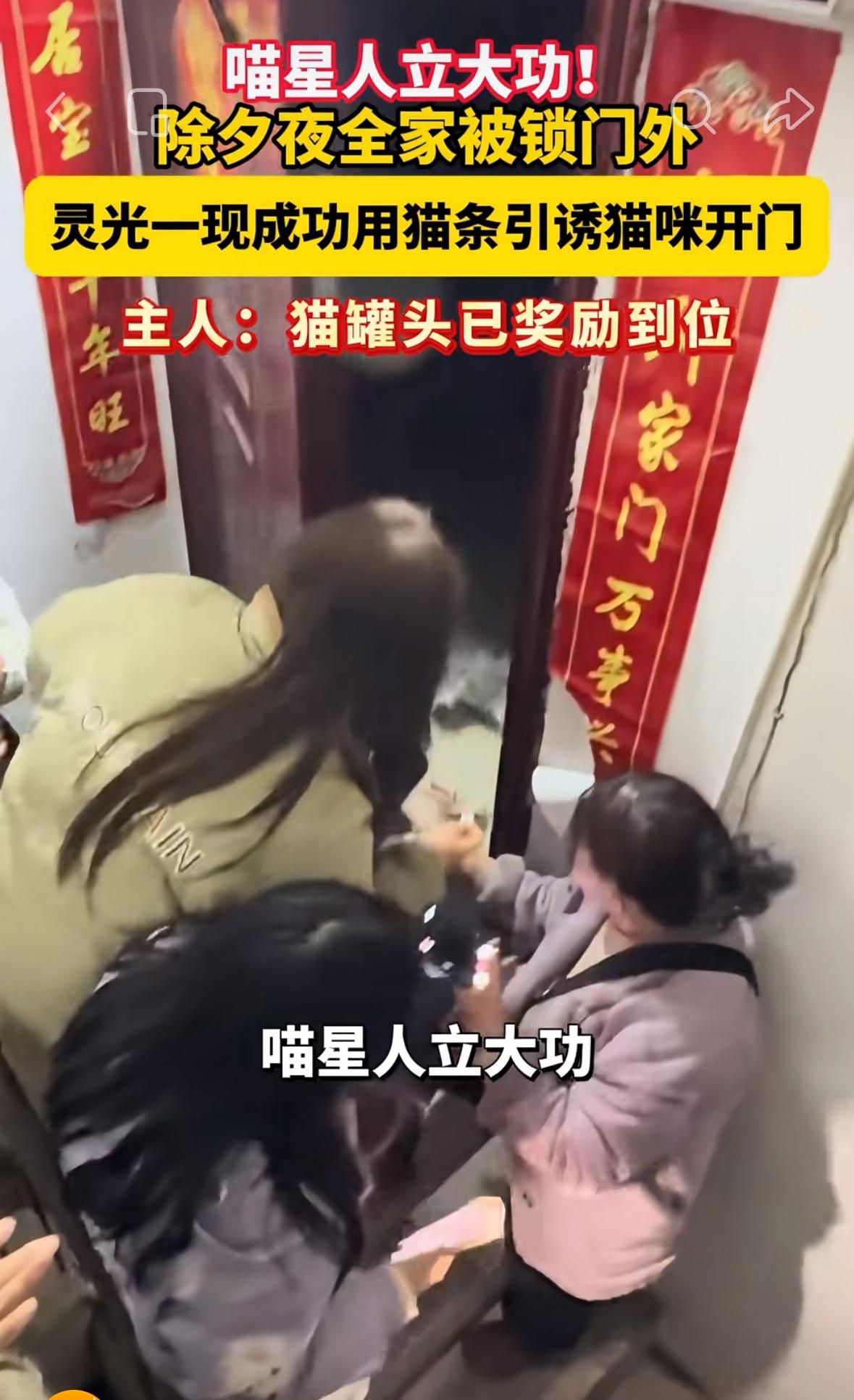 真的封神了! 除夕救全家于危难的, 居然是 家里这只猫! 湖北一家人本来开开心心准备出去吃年夜饭,走到半路才想起东西没拿,折返回去又发现钥匙被锁在家里。大过年的,开锁师傅全都放假,五口人站在门外,急得一点办法都没有。 就在所有人都一筹莫展的时候,自家猫咪遛弯回来了。主人抱着死马当活马医的心态,把猫从透气小窗送进屋里,隔着门指挥它开门。 本来只是碰碰运气,没想到几分钟后,门锁“咔哒”一声直接打开!这只5岁的猫咪,平时就学会了开门,这次直接成了全家的大功臣。 很多人总说养猫没用,只能卖萌撒娇,可真正养过的人才懂,小动物的爱最实在。你平时对它一分好,它会在你最无助的时候,用自己的方式守护你。 爱是双向奔赴,从来都不分物种。你家毛孩子有没有做过让你特别感动的事?来评论区聊聊~
