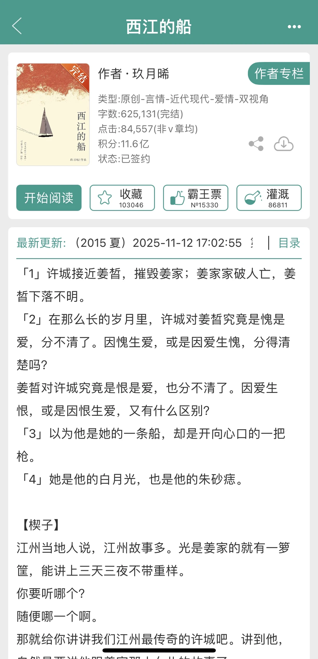 【1】许城接近姜皙,摧毁姜家;姜家家破人亡,姜皙下落不明。【2】在那么长的岁月里,许城对姜皙究竟是愧还是爱,分不清了。因愧生爱,或是因爱生愧,分的清楚吗?【3】她以为他是她的一条船,却是开向心口的一把枪。【4】她是他的白月光,也是他的朱砂痣。江洲当地人说,江洲故事多。光是姜家的就有一箩筐,能讲上三天三夜不带重样。你要听哪一个?随便哪一个啊。那就给你讲讲我们江洲最传奇的许城吧。讲到他,自然是要讲他跟姜家那小女儿的故事了。从哪一年讲起呢——