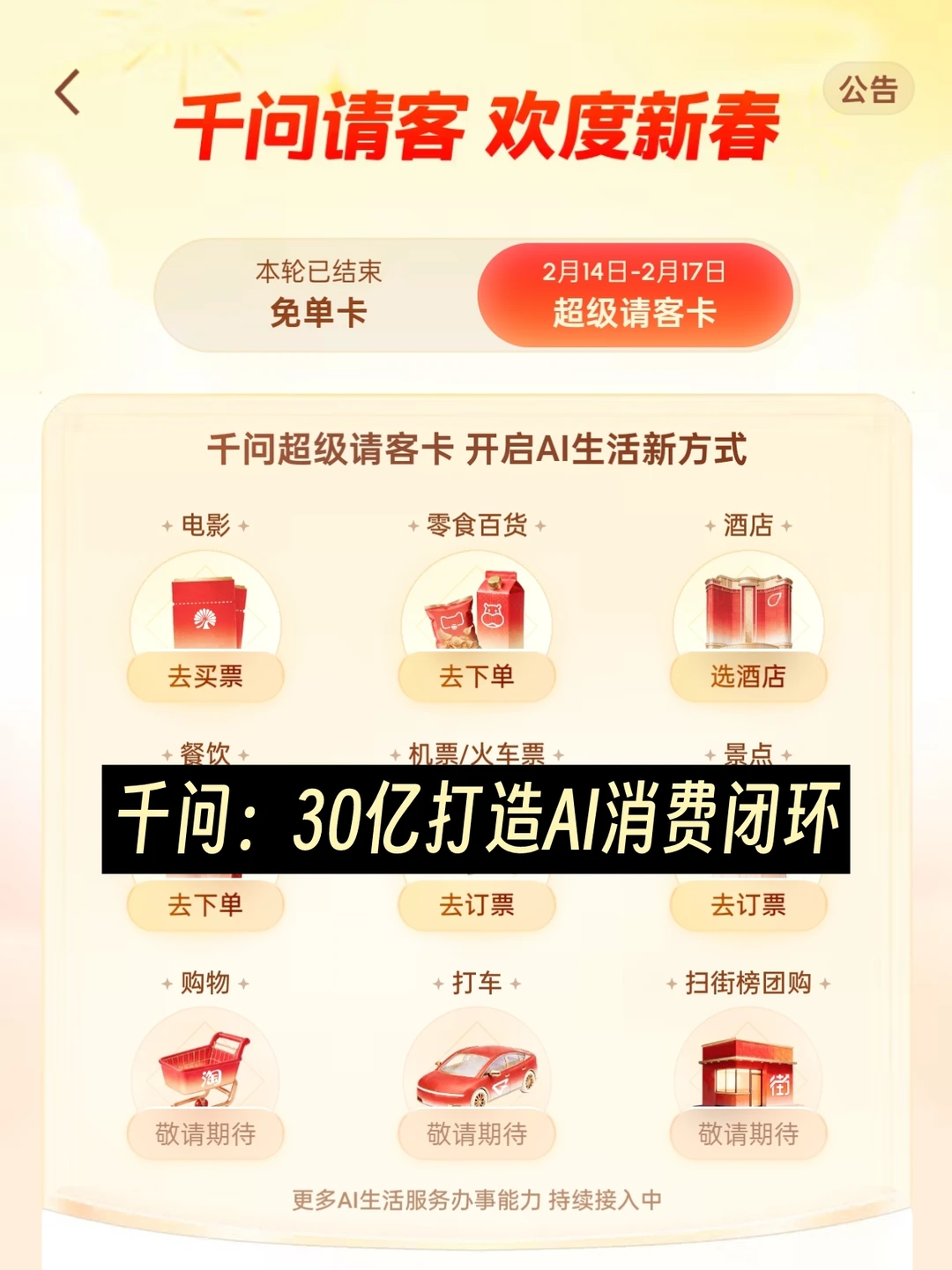 其次是阿里千问:投入30亿启动【春节请客计划】,联合淘宝、盒马、飞猪等生态平台,一句话让AI帮你免单喝奶茶、买菜,主打AI+消费闭环。