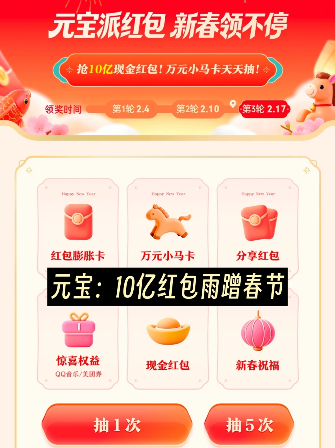 首先是腾讯元宝:砸10亿现金启动红包雨,绑定微信玩社交生态,主打AI+社交场景渗透。