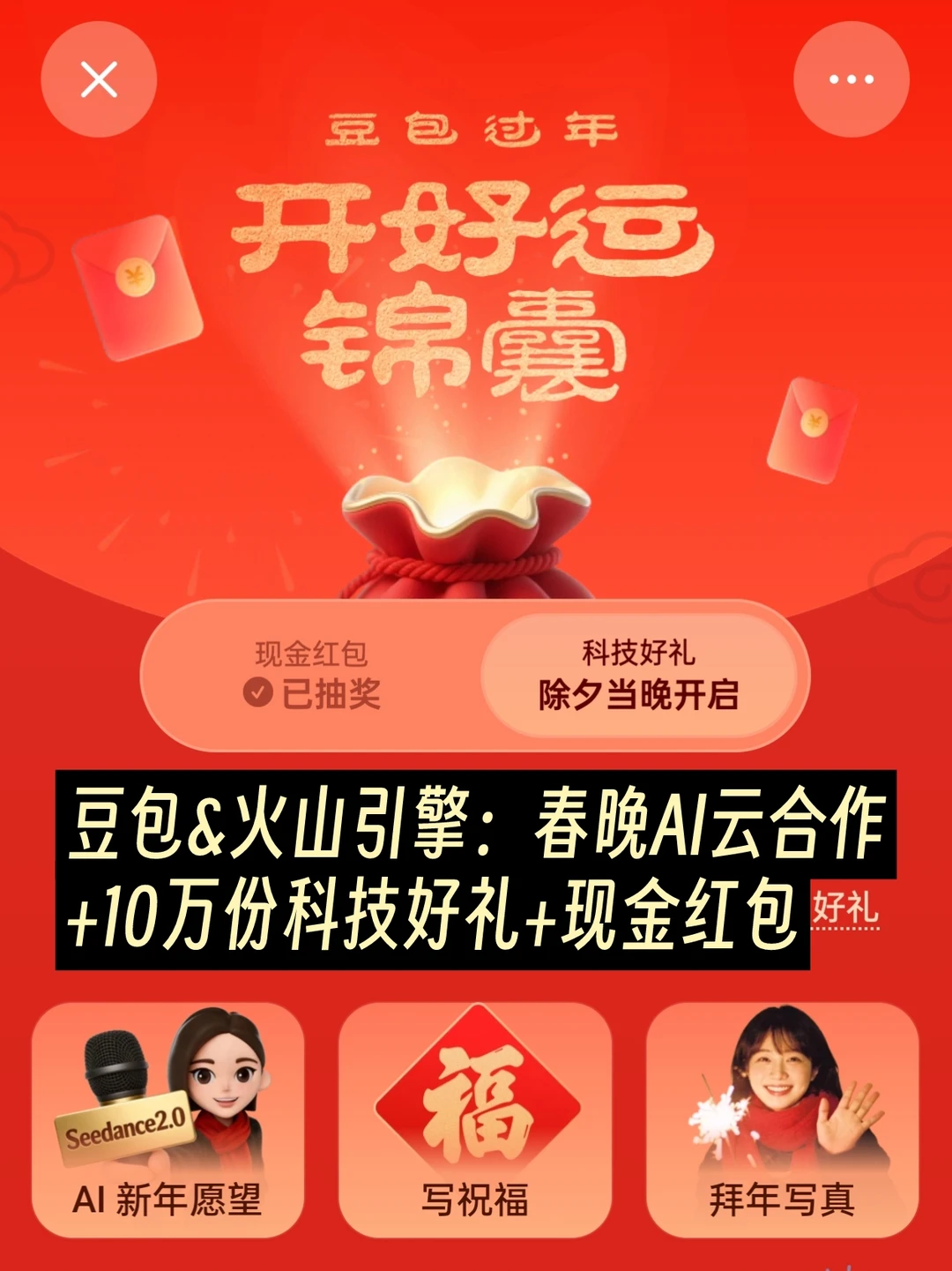 还有字节旗下的火山引擎,拿下央视春晚独家AI云合作,豆包同步送超10万份科技礼包+现金红包,实现品牌+技术双重曝光。