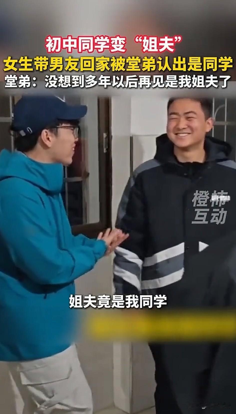 女生过年带男友回家, 结果一进家门就被认出来了, 他的堂弟发现初中同学, 居然成了自己的姐夫, 两个人瞬间笑出了声, 说当年毕业之后就再也没有见过, 没想到过年还能再见一面, 居然成了自己的姐夫, 世间还真是无巧不成书, 两个人瞬间聊的火热, 家庭气氛越来越浓, 女子的男友也没有那么矜持了, 就像一家人一样,热热闹闹过大年, 两个人的初中同学关系, 瞬间让两家走的更近了, 本来男友跟女友回家过年, 由于陌生和不确定, 还非常担心这次被带回家, 结果遇到自己的初中同学, 瞬间也不紧张了, 大家对于初中同学变姐夫的事儿怎么看? 过年