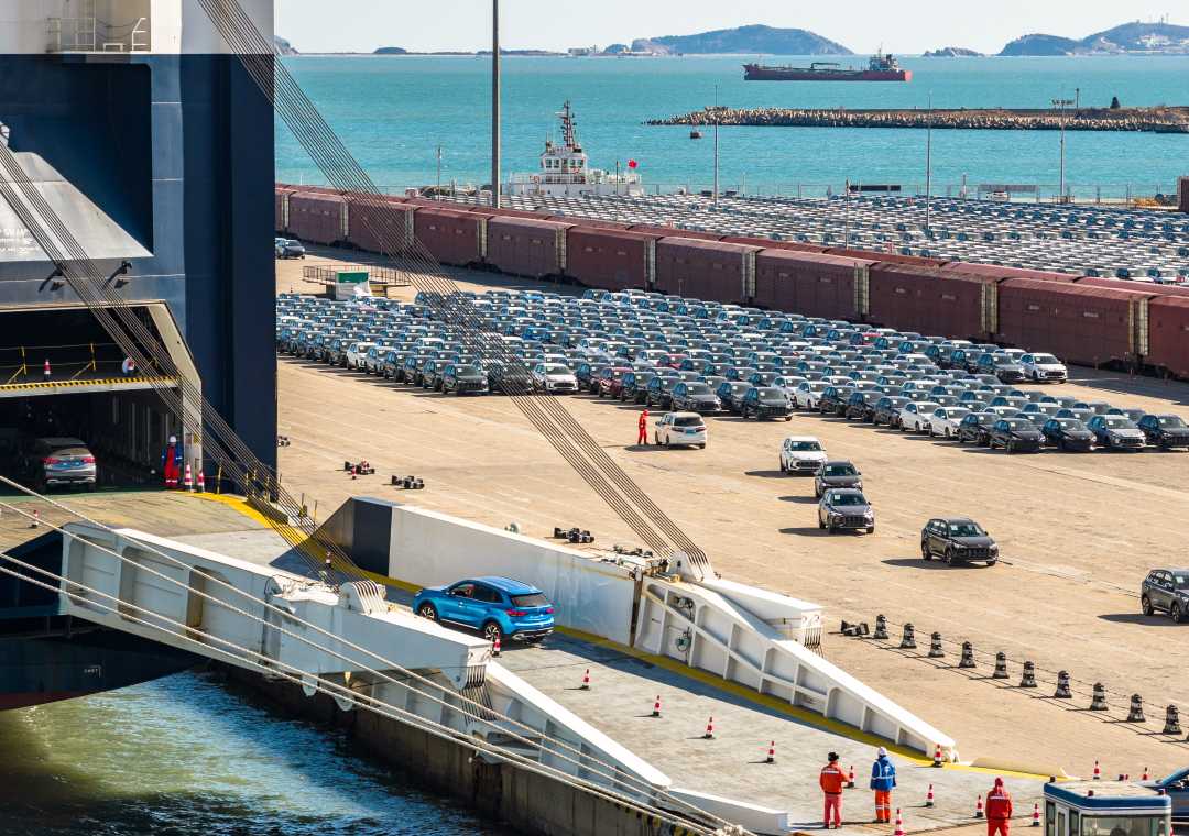 2月18日,山东港口烟台港商品车滚装码头,工作人员驾驶商品车驶入运输船等待发运。