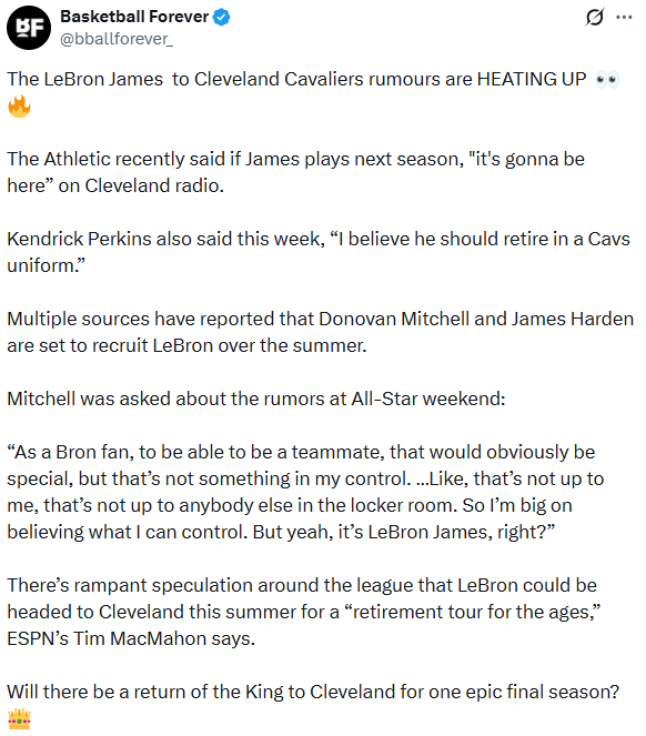 虎扑02月18日讯今日,美国媒体BasketballForever更新社媒,分享了近期关于勒布朗-詹姆斯夏天重返克利夫兰骑士队的传闻: