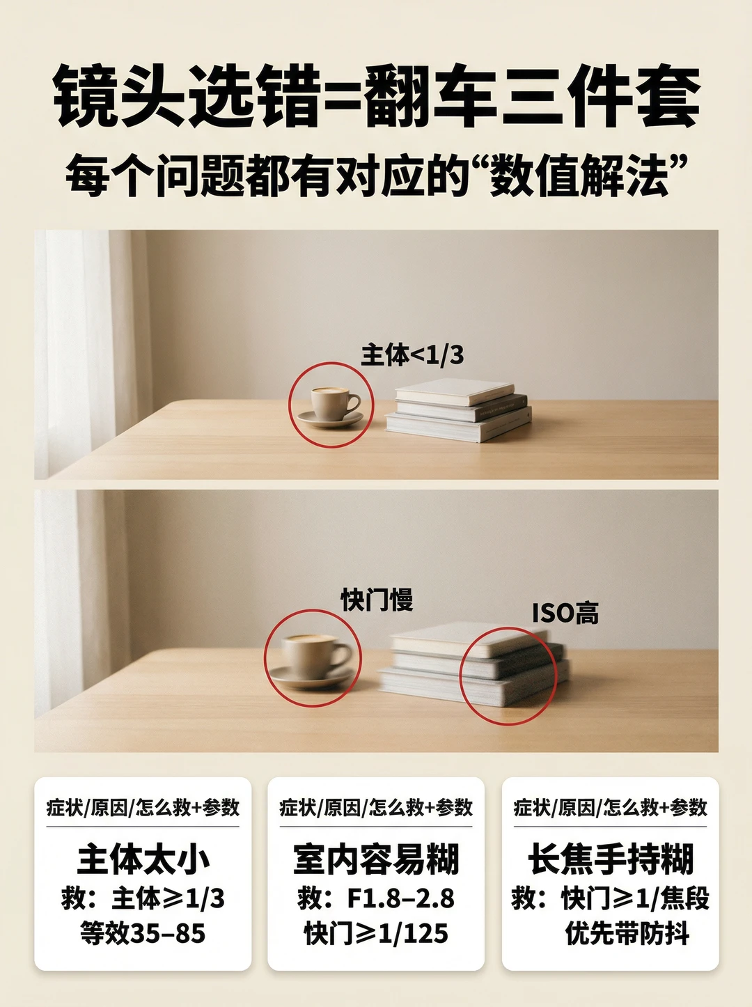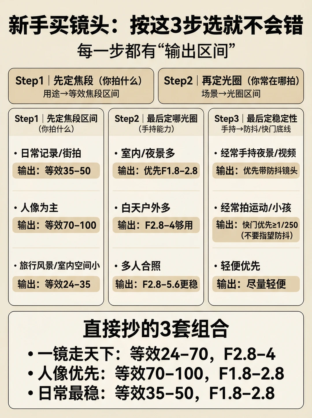 新手买镜头最容易走弯路:跟风买“大光圈/大变焦”,结果室内还是糊、合照还是怪、长焦夜拍糊成一片。