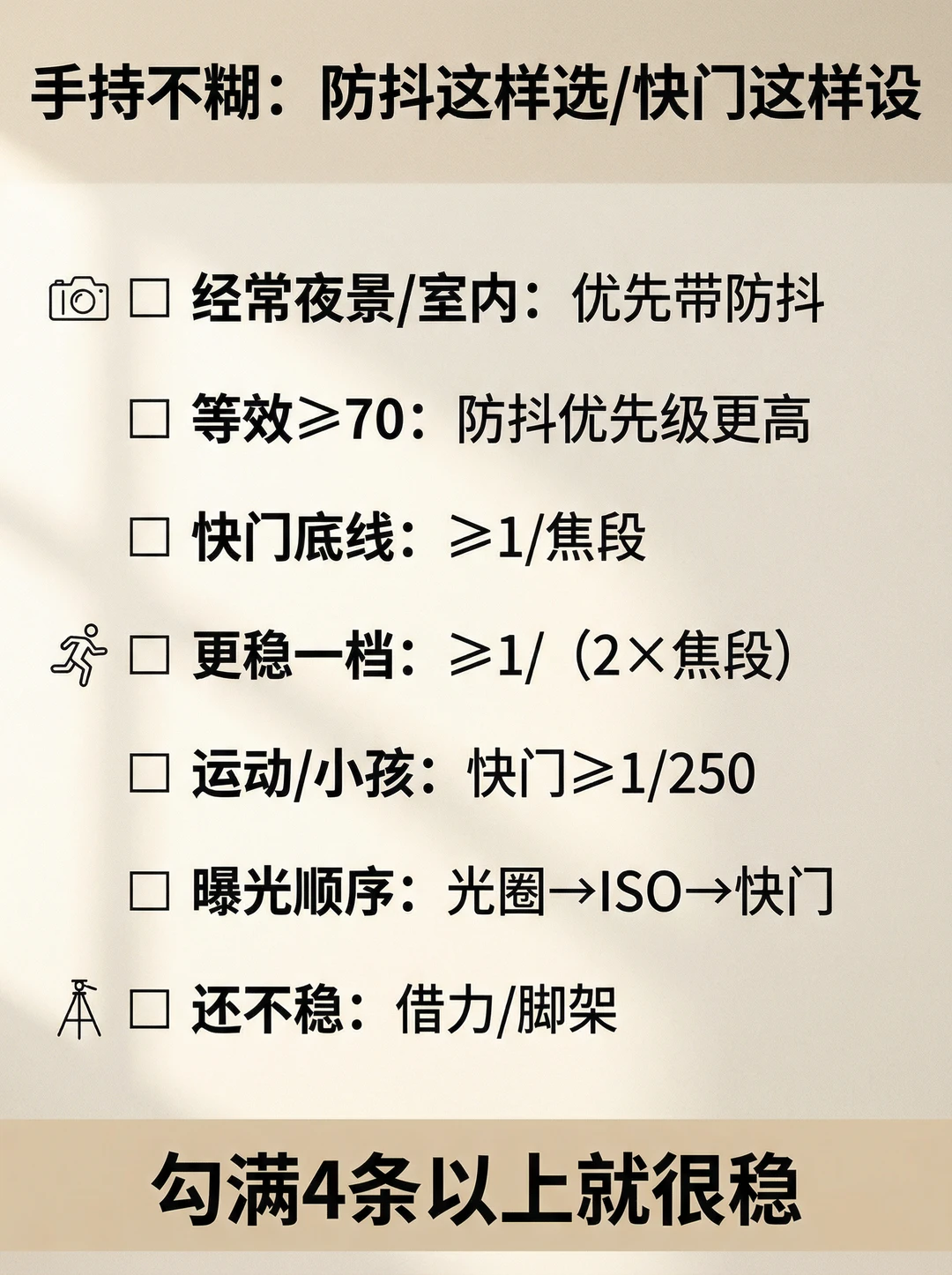 • 安全快门:≥1/焦段,更稳:≥1/(2×焦段)